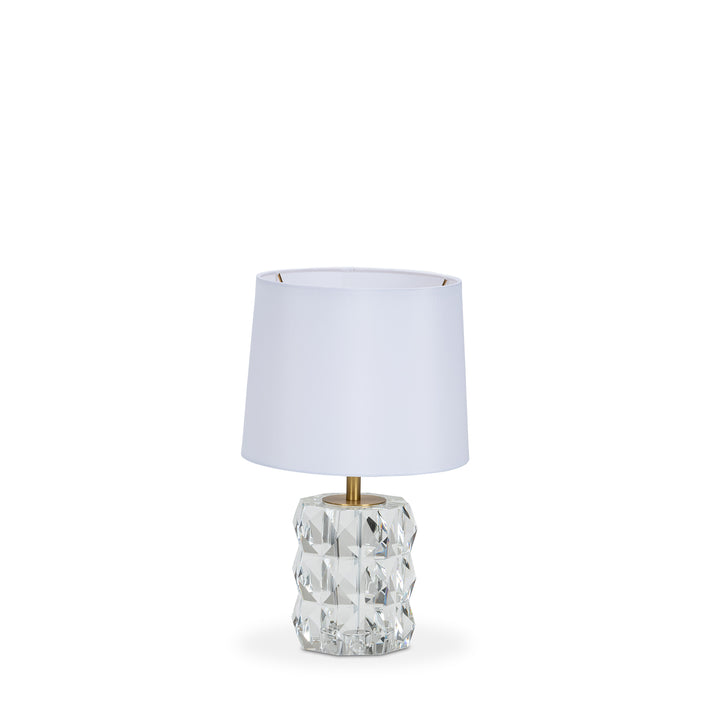 Rooted in the elegance of the art deco era, this table lamp captures the movement’s sculptural essence through a faceted crystal base of striking clarity. Subtle brass detailing completes the composition with a sense of timeless refinement.