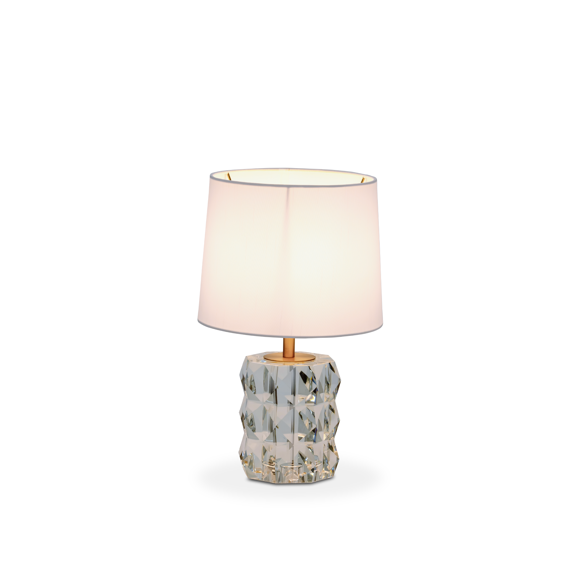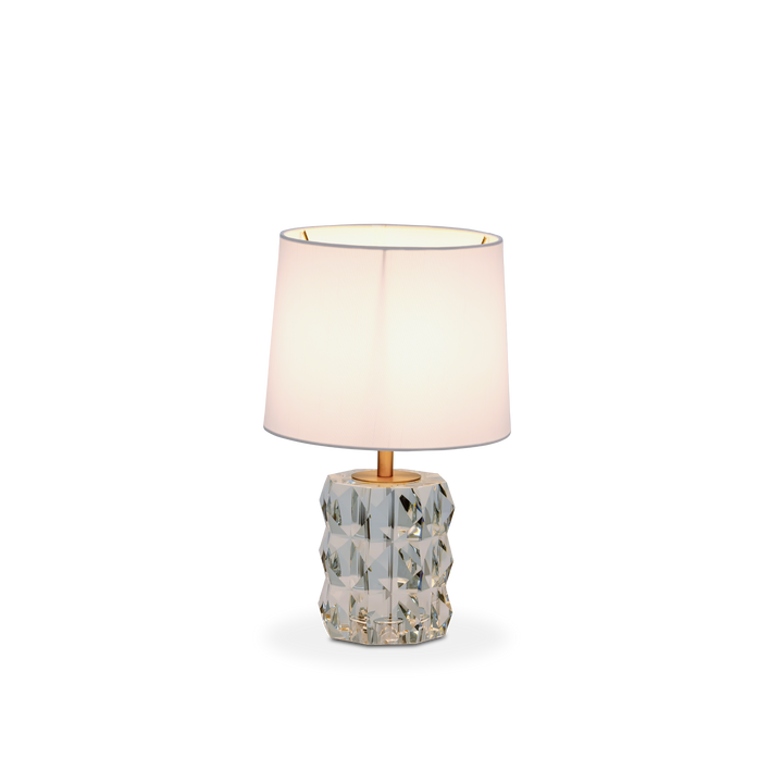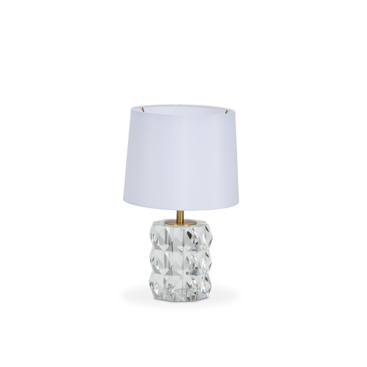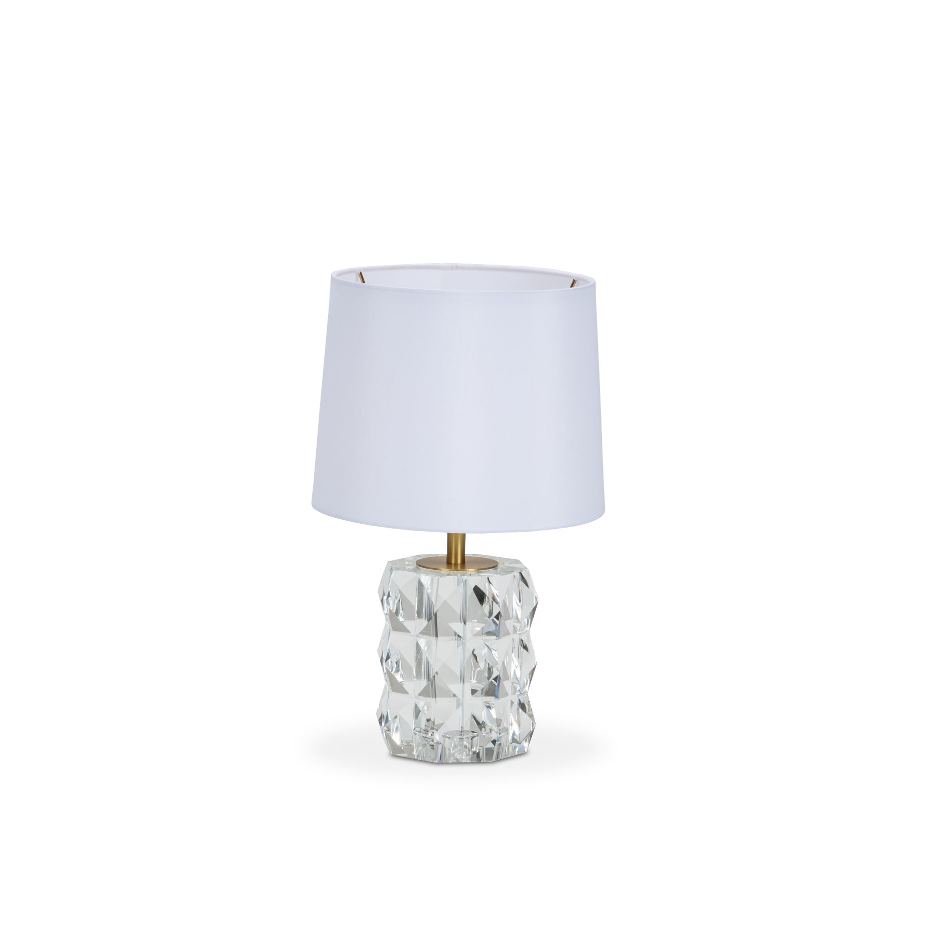 This table lamp blends modern charm with timeless elegance, featuring a beautifully cut crystal base accented by an antique brass finish.