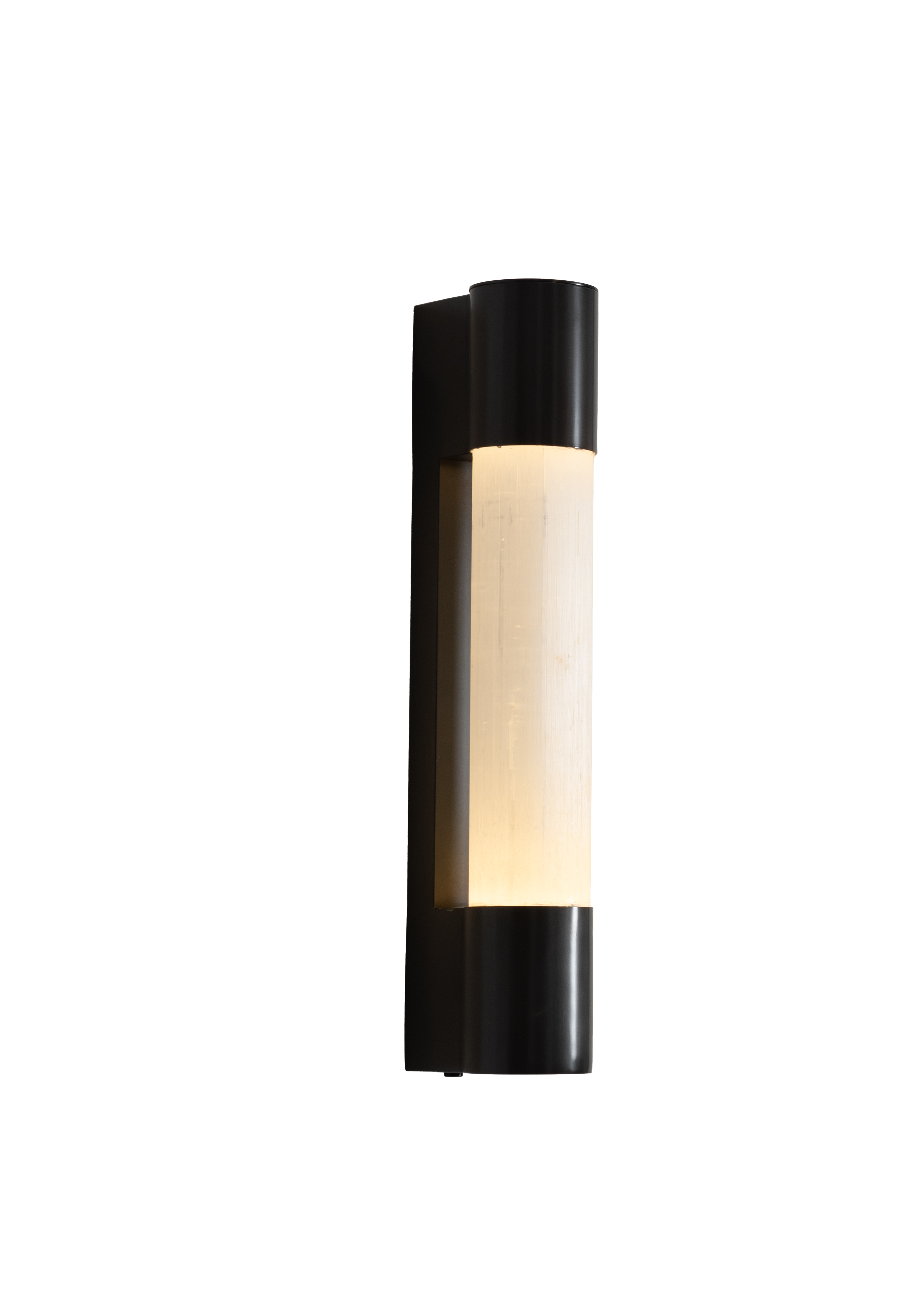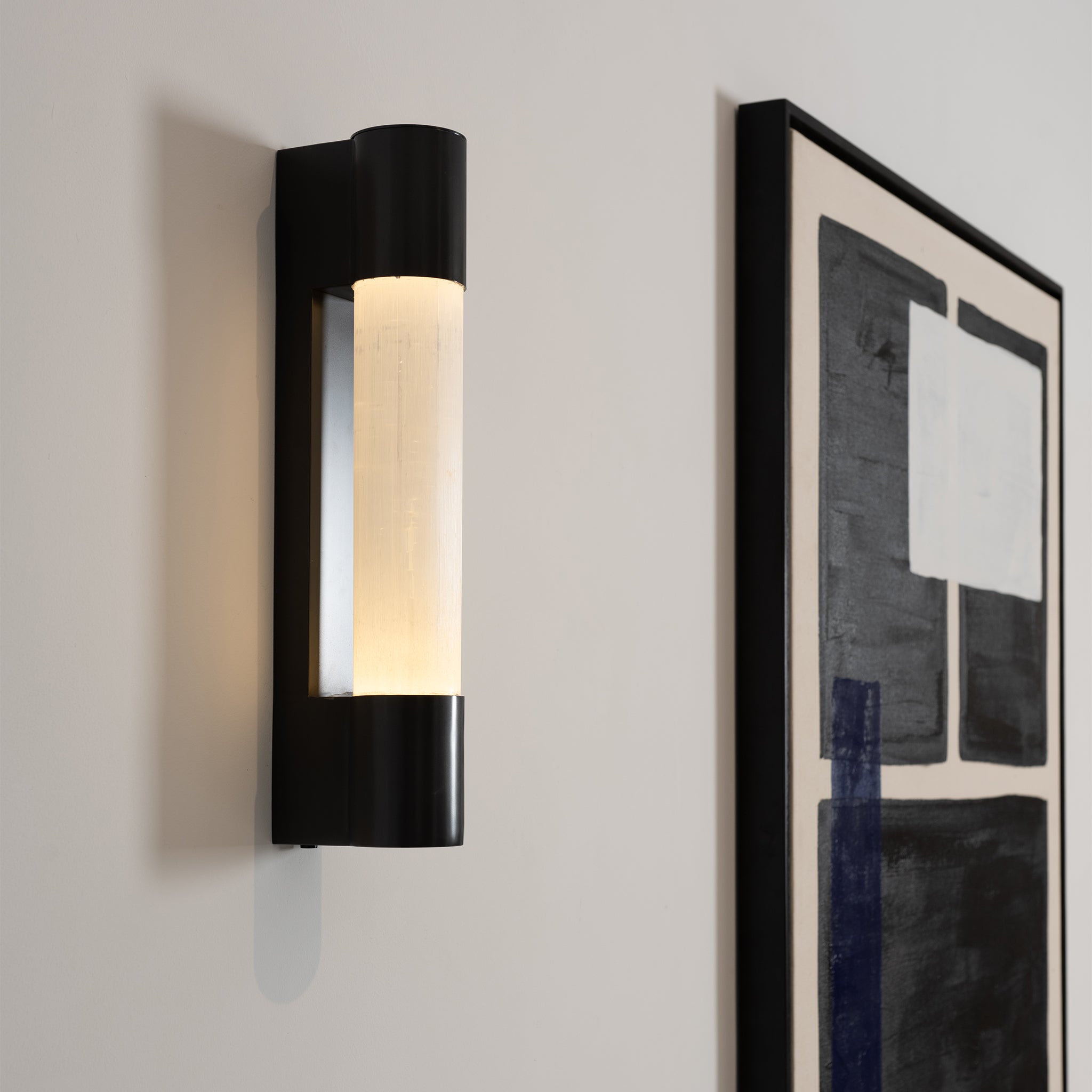 Defined by simplicity and material elegance, this wall lamp highlights the subtle texture of selenite within a modern design. The softly illuminated stone adds warmth and depth to the space.