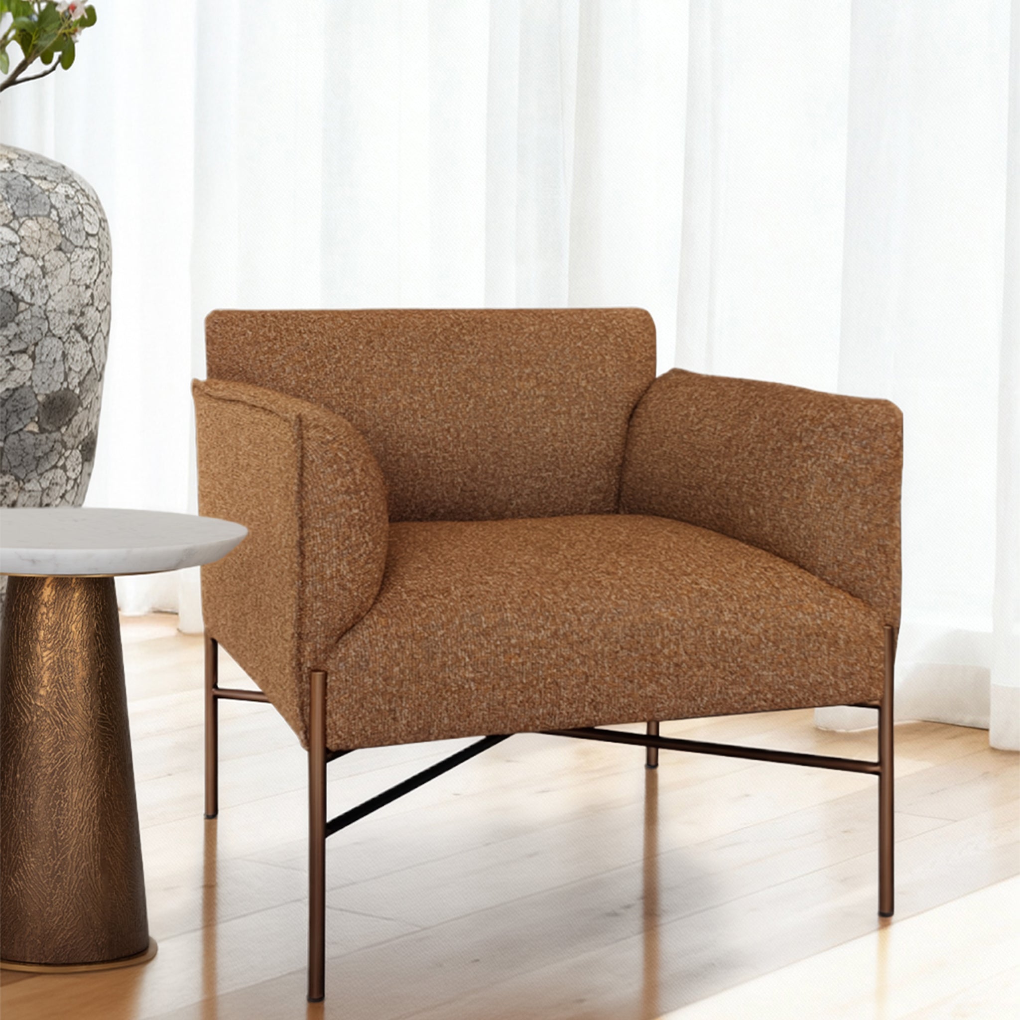 Upholstered in kernel chestnut fabric. Designed with sturdy stainless steel legs electroplated in a brushed bronze finish, this piece combines style with timeless elegance.