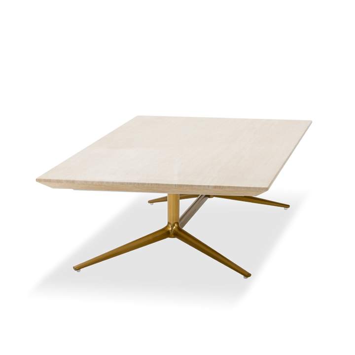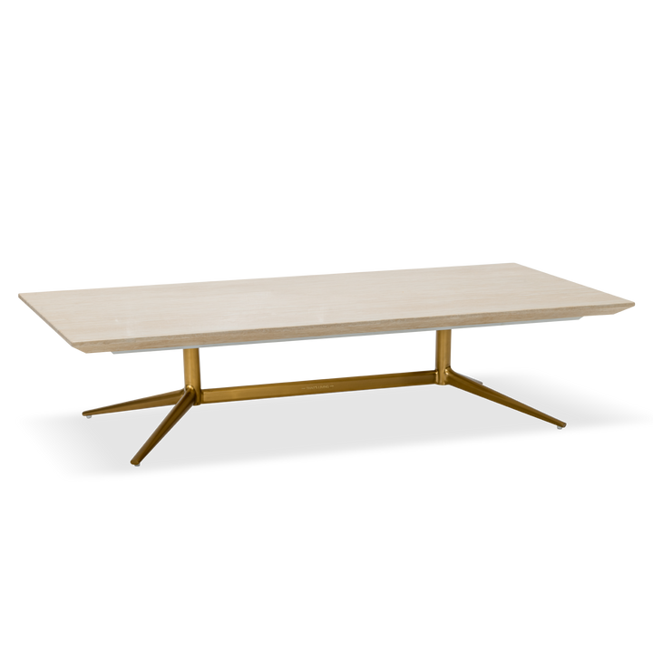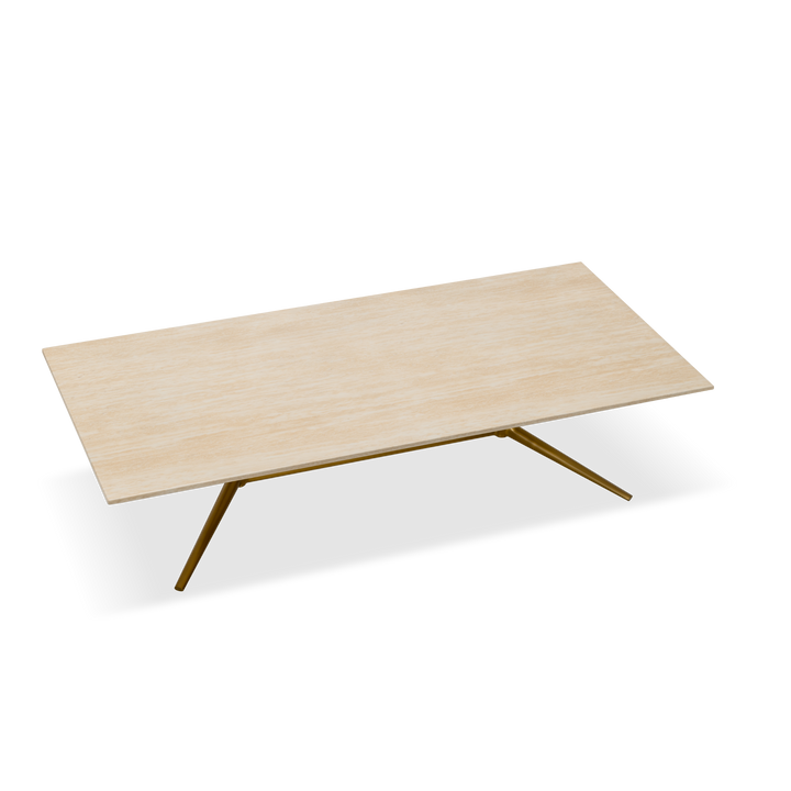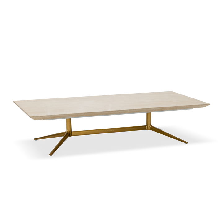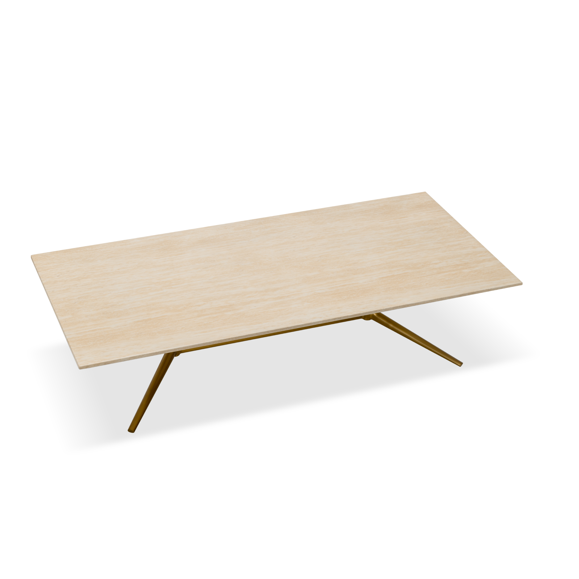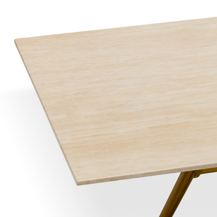 Polished beige travertine forms the rectangular top finished with a PU coating for added durability. The stainless steel base electroplated in brushed brass enhances the overall elegance of the design.