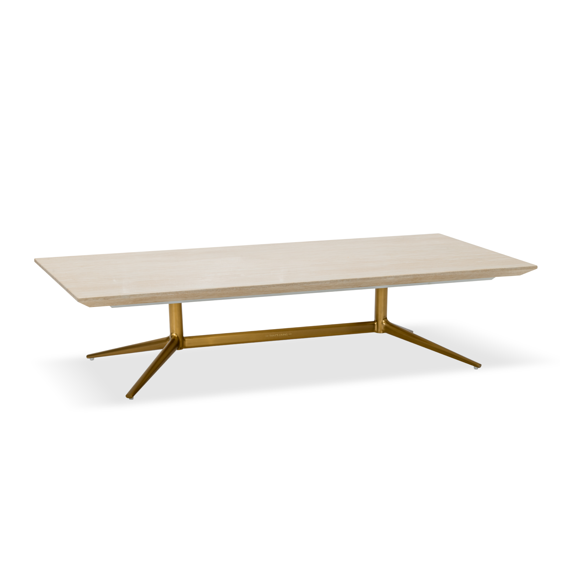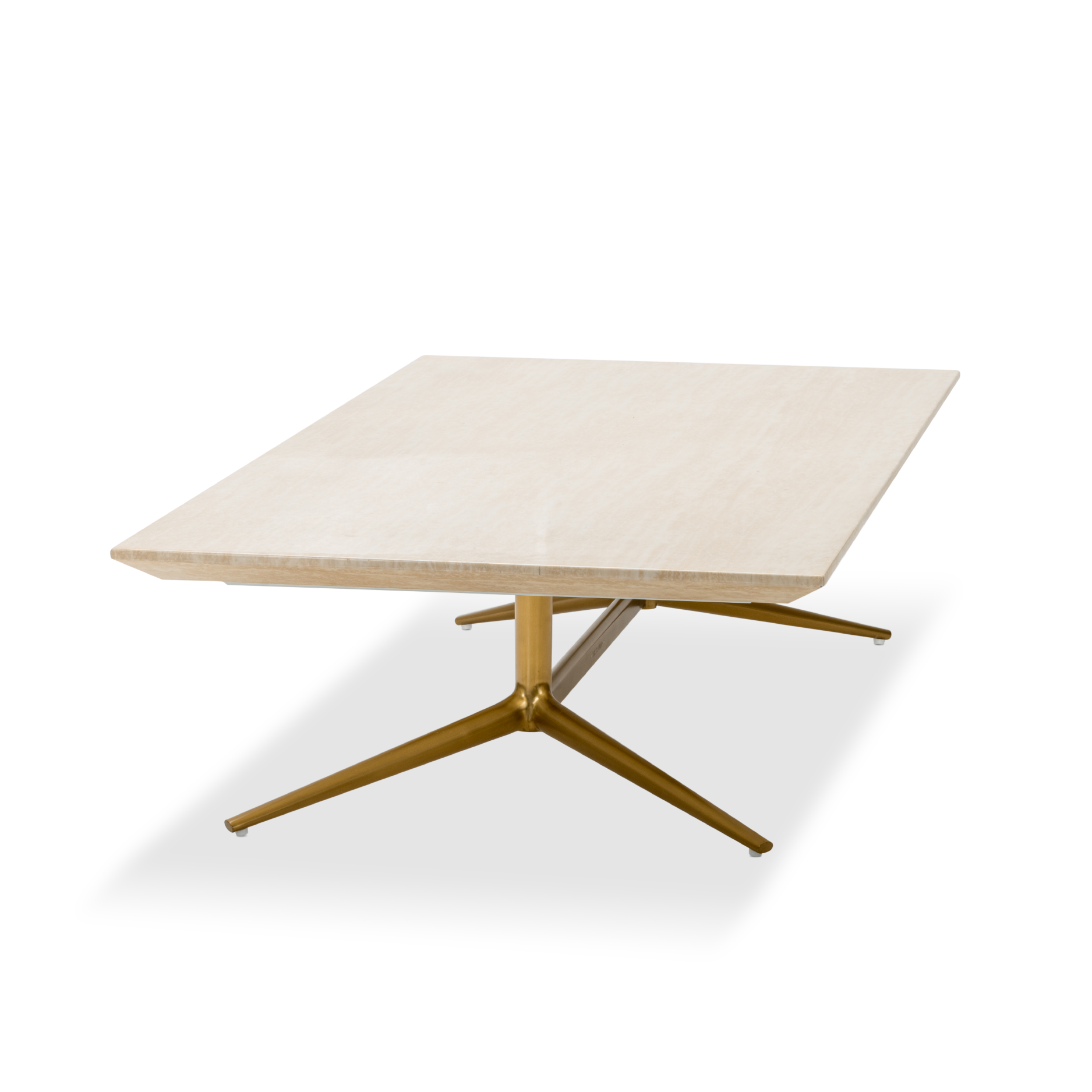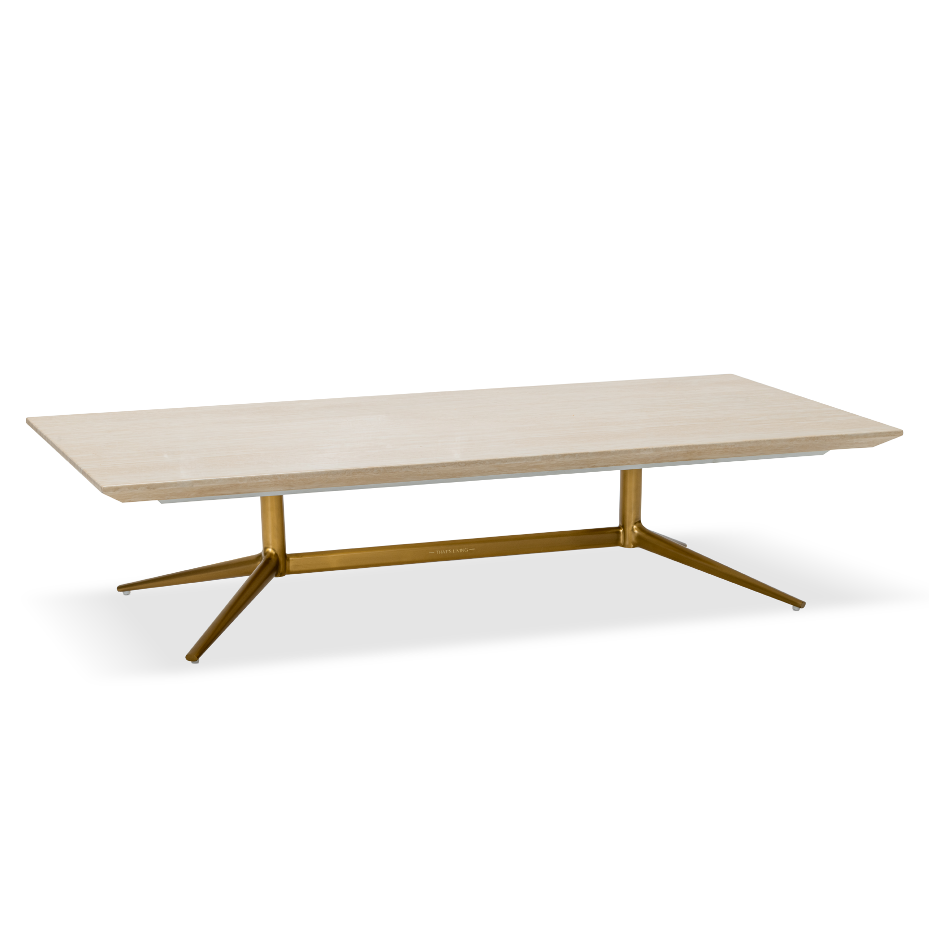 Polished beige travertine forms the rectangular top finished with a PU coating for added durability. The stainless steel base electroplated in brushed brass enhances the overall elegance of the design.
