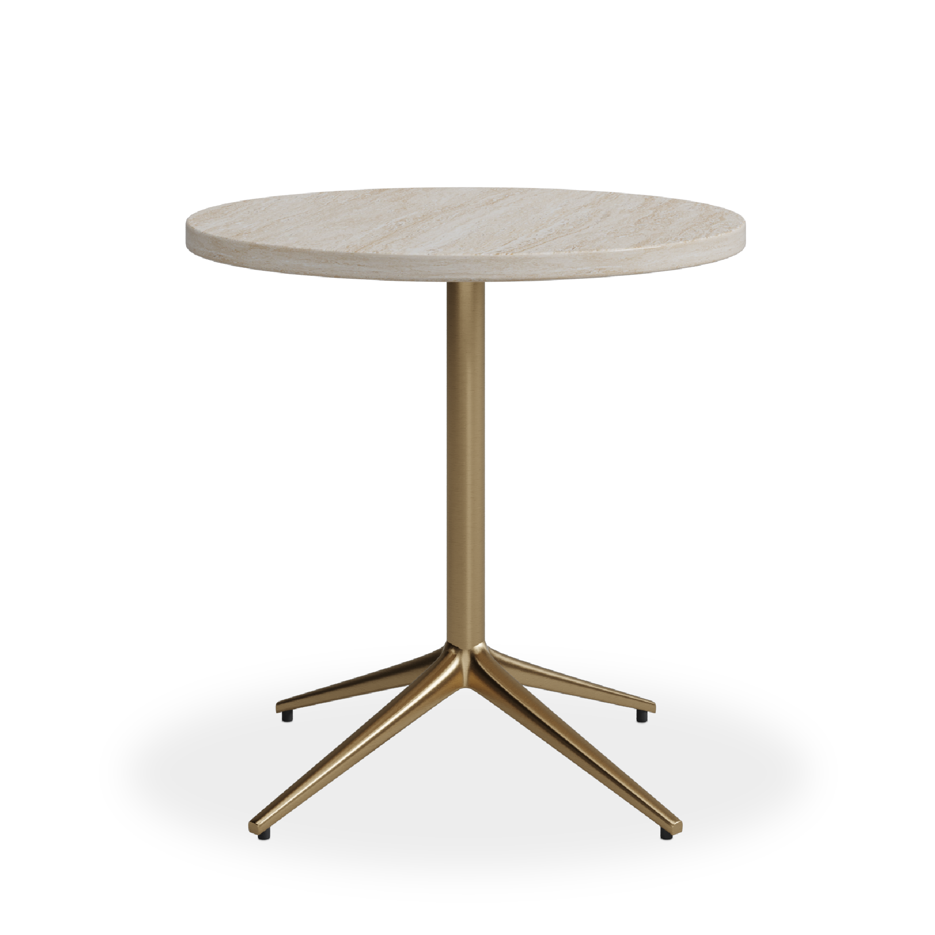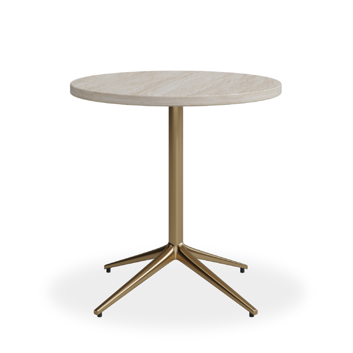 Round end table featuring a polished beige travertine top with a protective PU coating for enhanced durability. The base, crafted from stainless steel and electroplated in brushed brass, adds a modern touch.