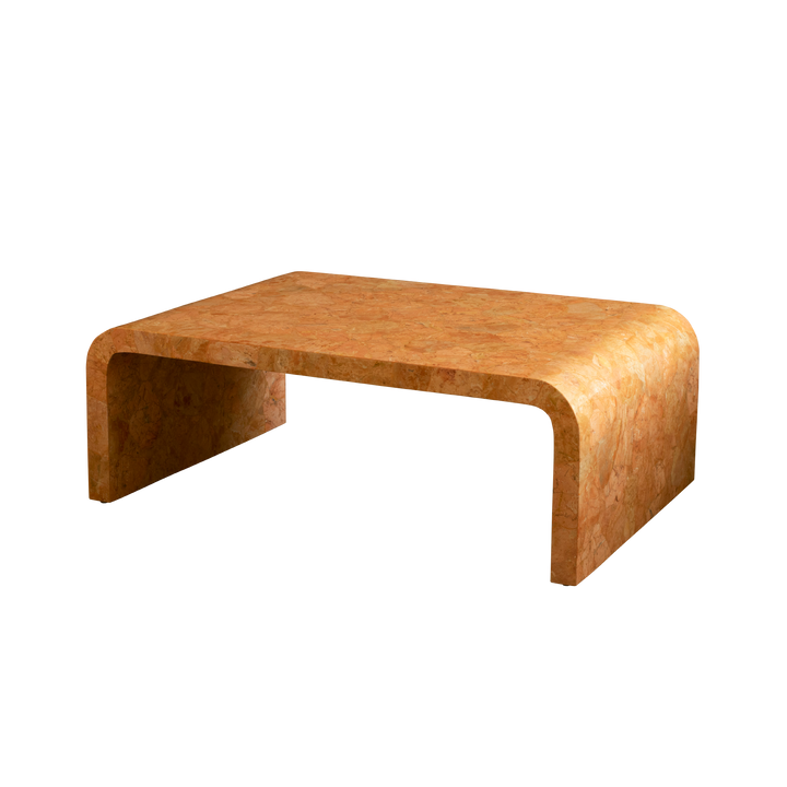This modern coffee table features a sleek, minimalist design fully finished in rare salmon marble from the southern islands of the Philippines. Its clean silhouette highlights the stone's unique veining, making it a striking centerpiece.