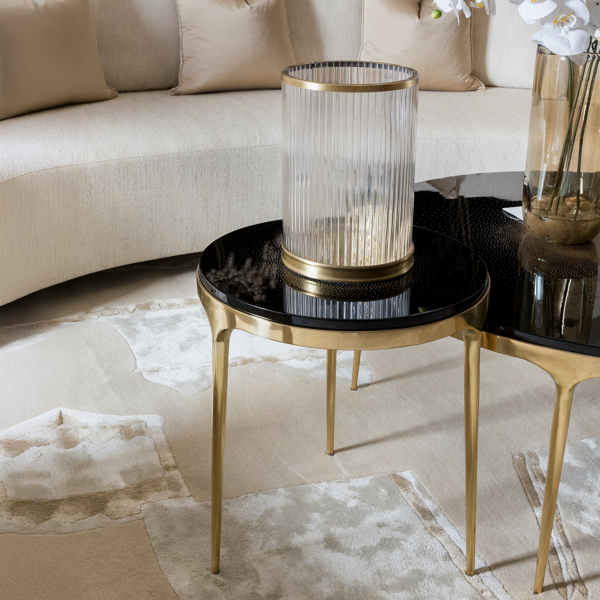 The tabletop features hand laid eggshell inlay, completed with a meticulous 10 step high gloss finish that highlights its artisanal craftsmanship and refined detail. The base, in polished natural brass, enhances the table’s sleek silhouette with timeless elegance.