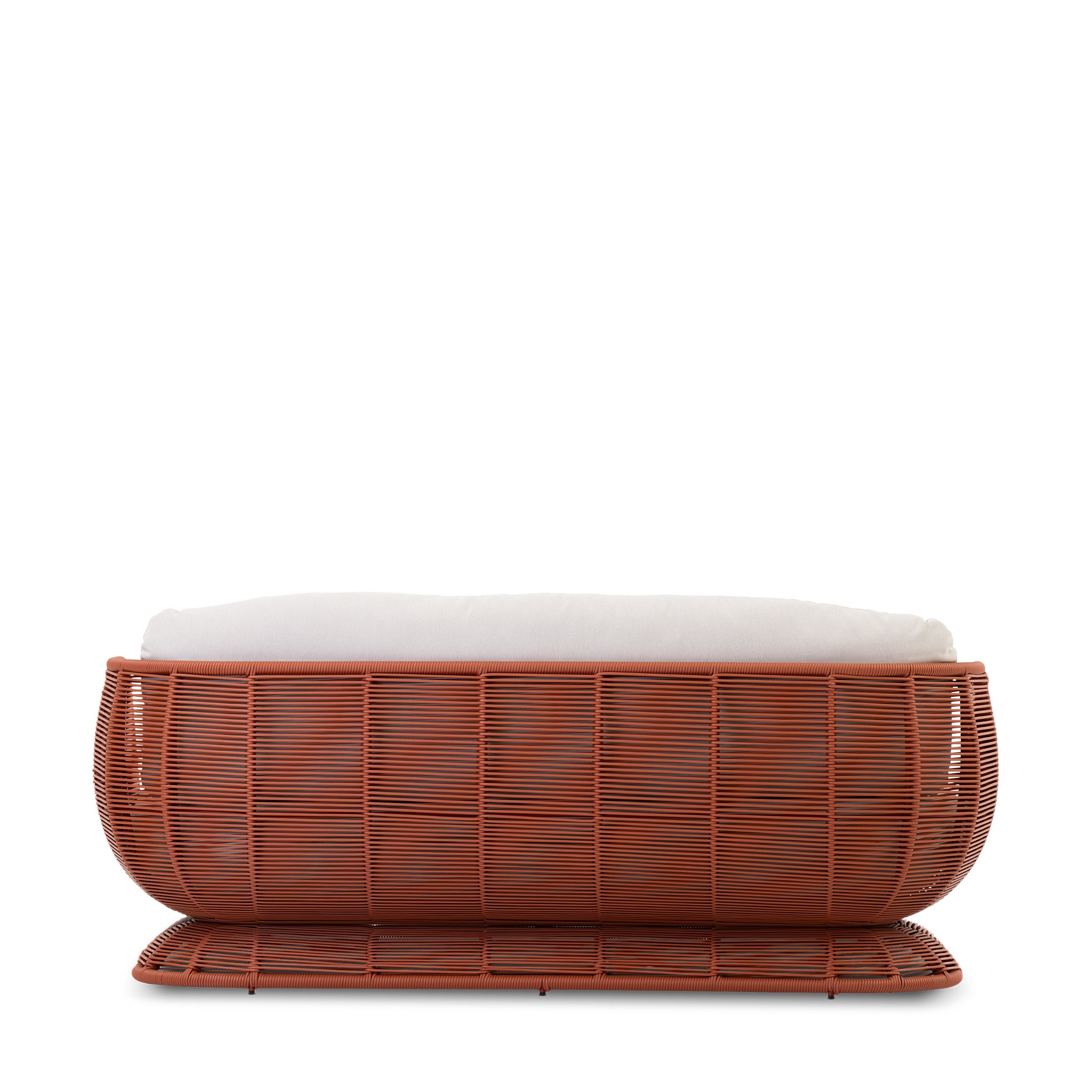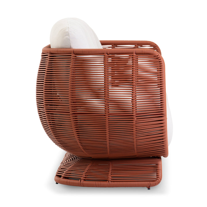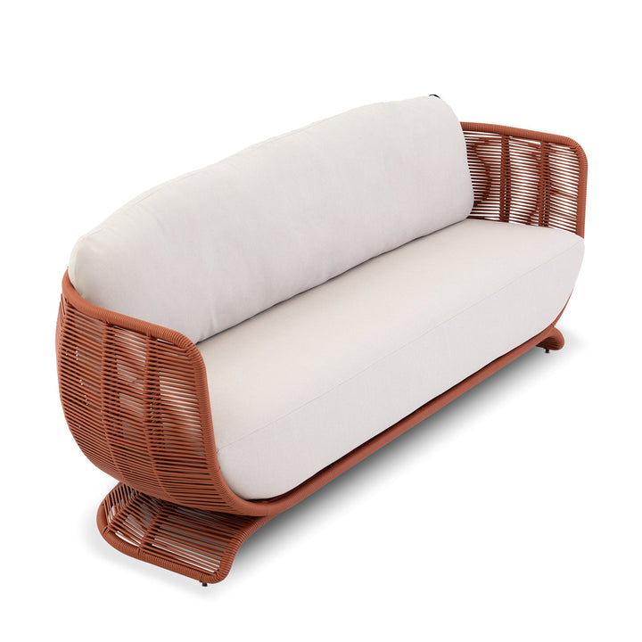 Sculpted with graceful curves, this outdoor sofa blends modern form with artisanal craftsmanship. The frame is wrapped in a terracotta hue, emphasizing its silhouette with subtle texture and rhythm. Latte-toned cushions, upholstered in weather-resistant olefin, offer plush support over quick-dry foam for enduring comfort. Resting on a powder-coated aluminum base, the piece brings quiet elegance to any open-air lounge.