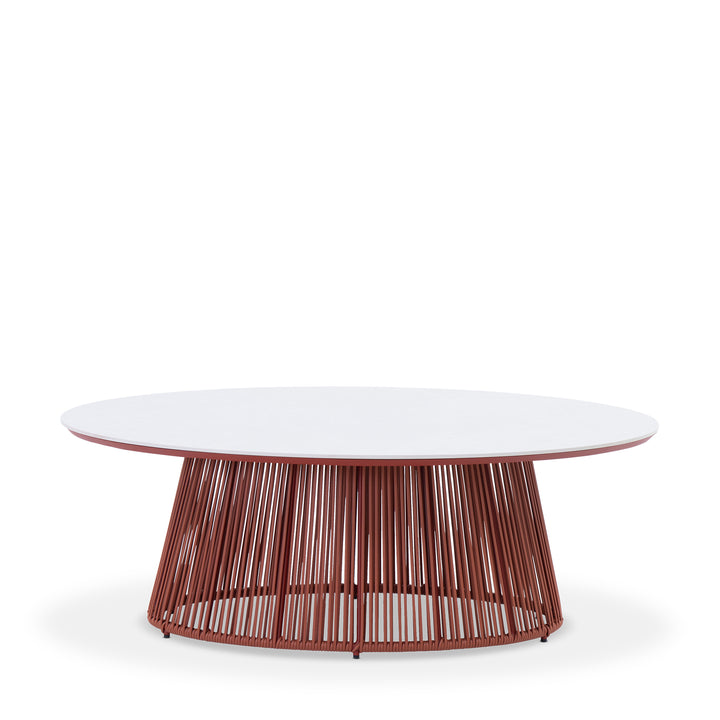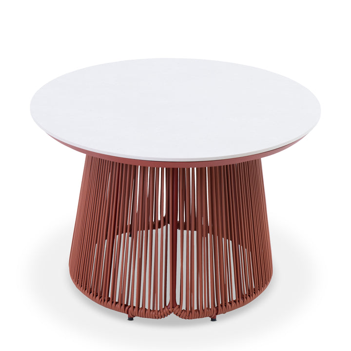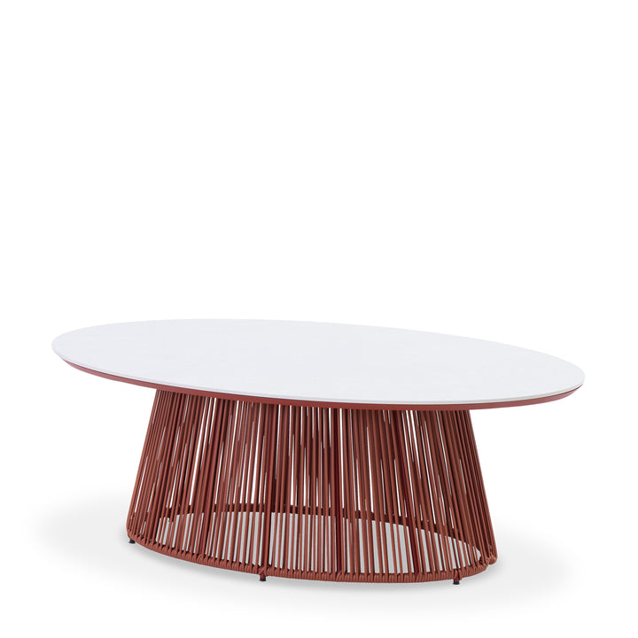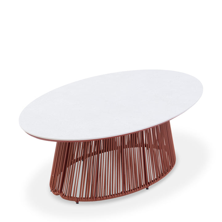 This coffee table features a ceramic oval top paired with a tapered base. It is finished with a powder-coated frame for added durability. The rich terracotta tone lends natural style and earthy elegance.The design extends the sphere collection’s modern style into your outdoor space.