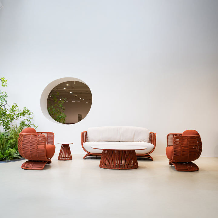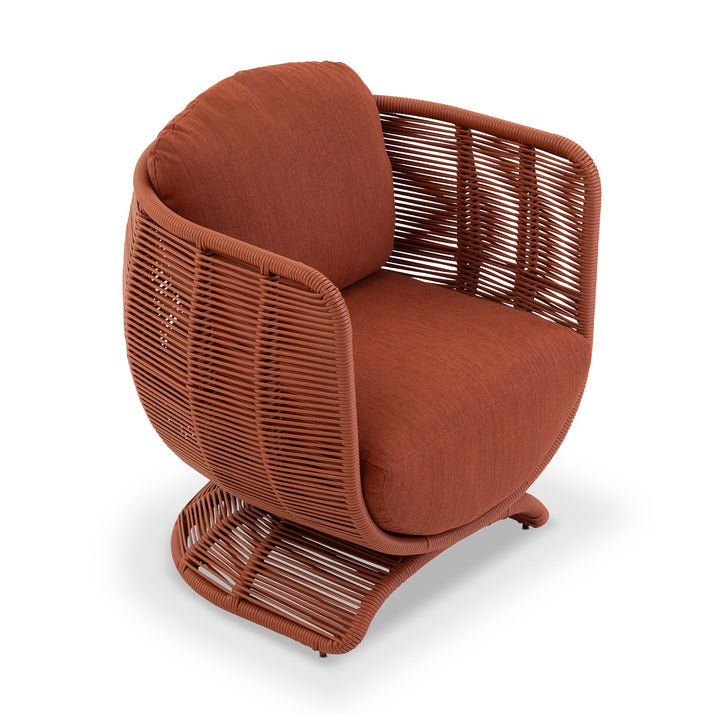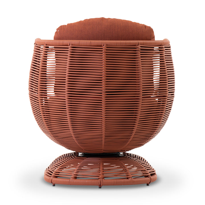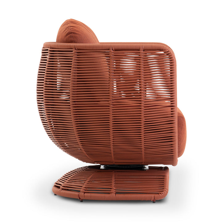 This outdoor lounge chair features a curved, low-profile frame wrapped in terracotta-hued rattan for bold texture and visual impact. Spice weave cushions with quick-dry fill offer plush, all-weather comfort, while a powder-coated aluminum base adds durability and modern edge. Complete the look by pairing it with the sphere 3-seater sofa.