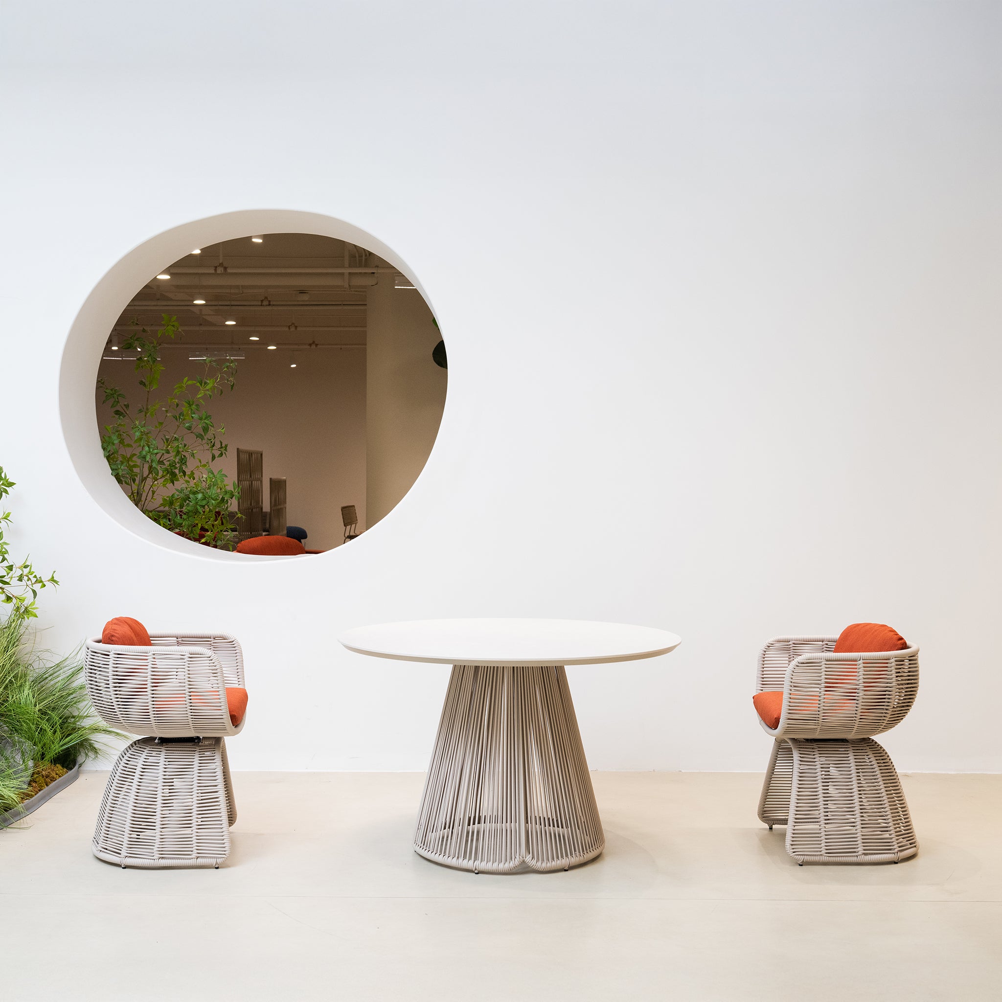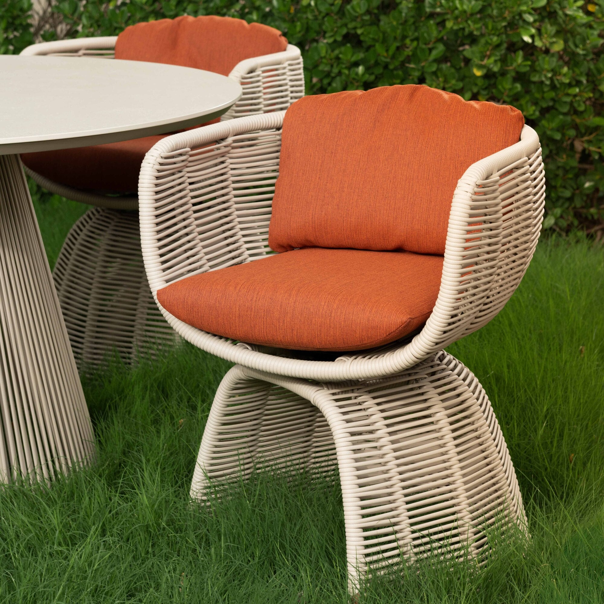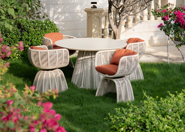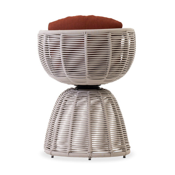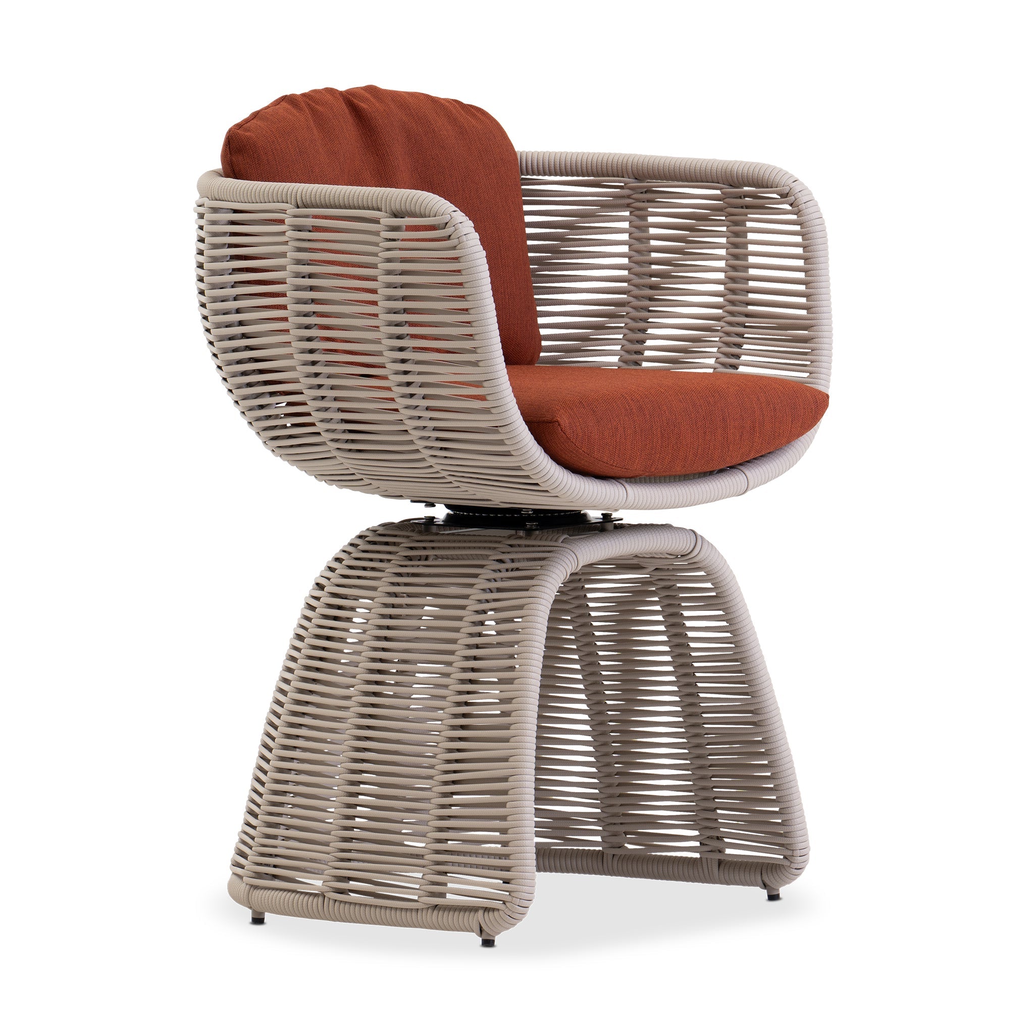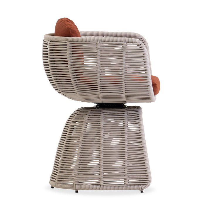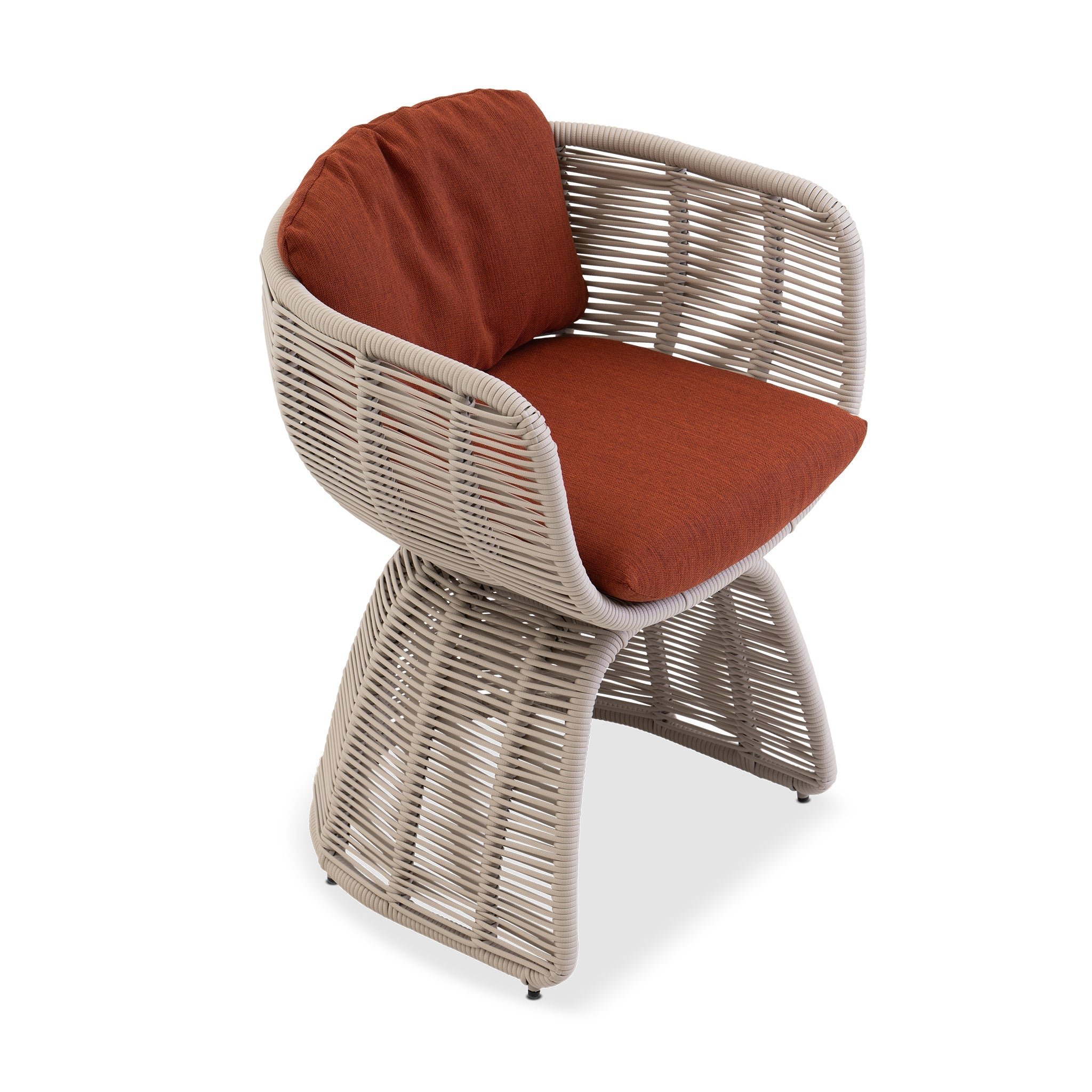 This bold silhouette sits atop an arched base, fully handwoven in taupe-hued rattan for a graphic yet grounded presence. The curved back and seat cradle the body with plush, quick-dry cushions in spice weave fabric, offering enduring comfort and striking contrast. A powder-coated aluminum frame adds structure and strength, designed to pair seamlessly with the embrace dining table for a stylish outdoor setup.