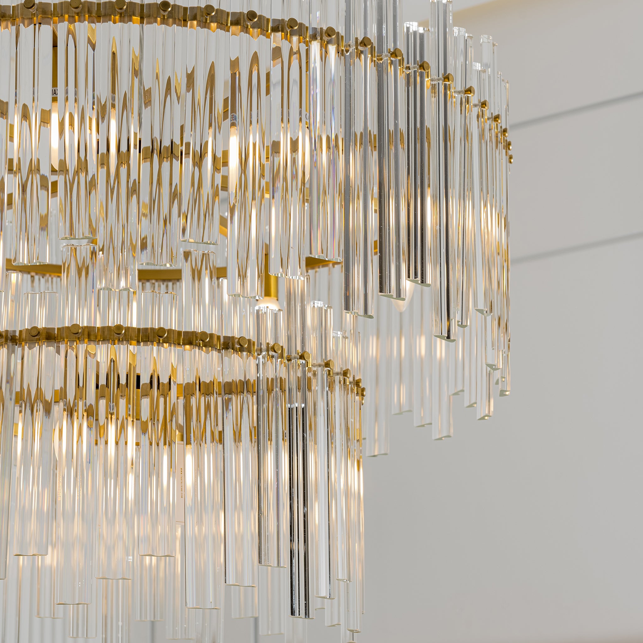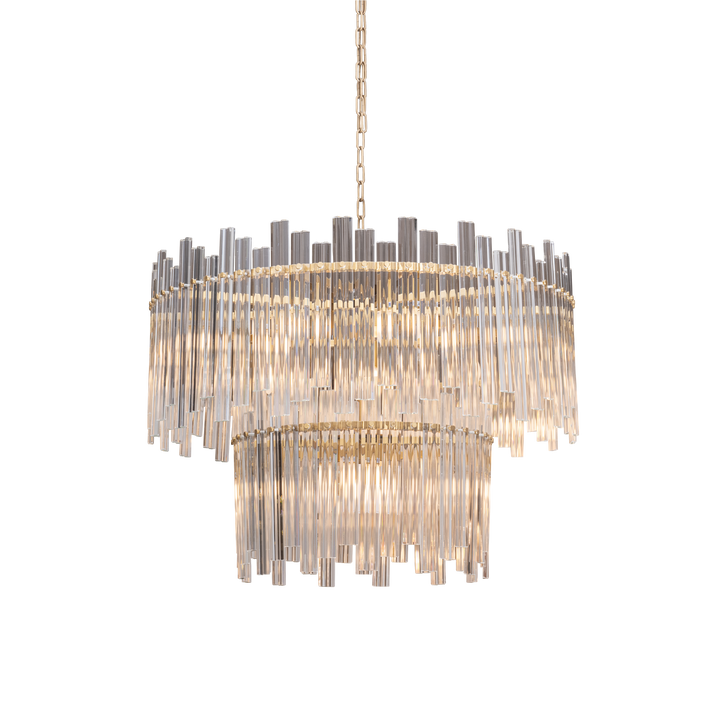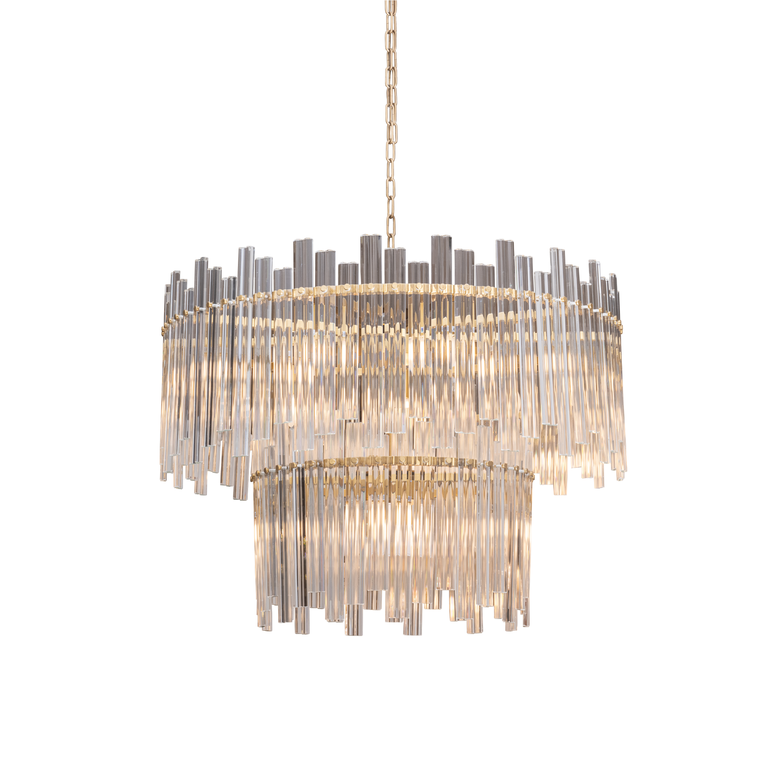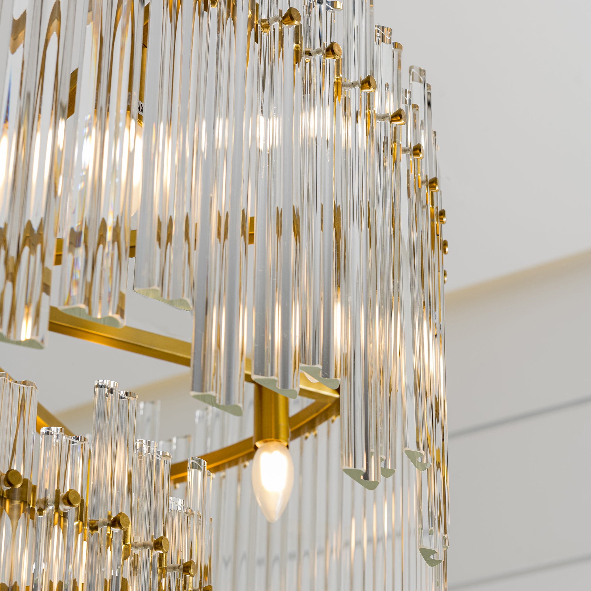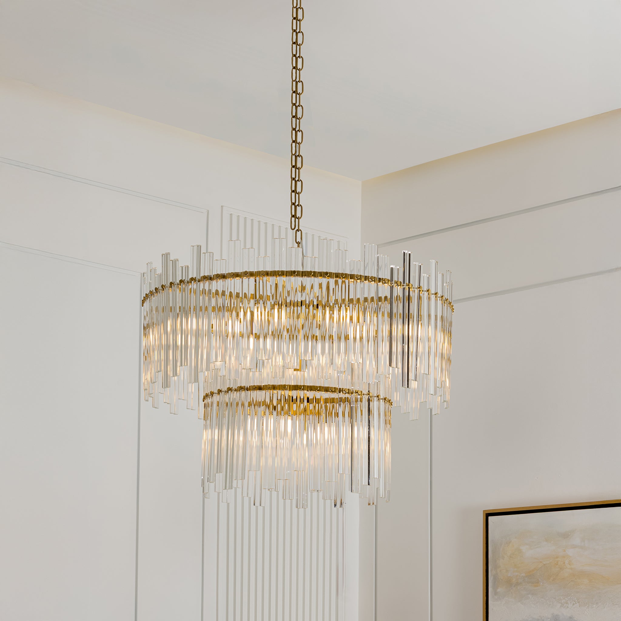 Part of our aster collection, this striking two-tier chandelier pairs clear fluted glass with an antique brass finish for a refined, architectural look. Inspired by art deco design, its unaligned glass pieces create depth and visual appeal.