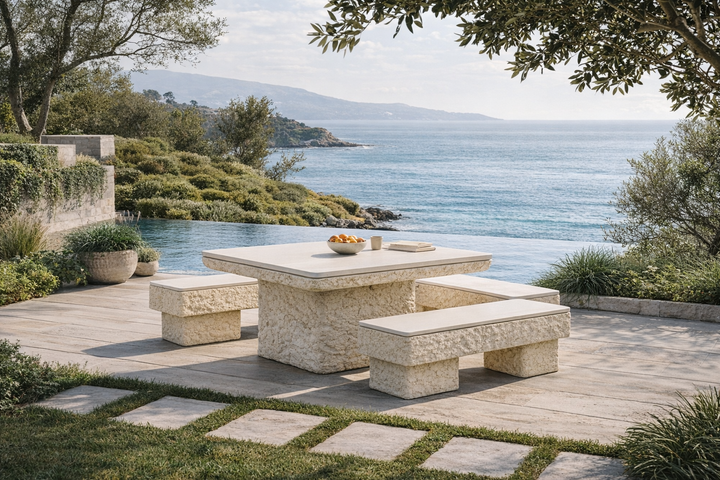 Defined by its bold, sculptural proportions, this dining table features a square top set above a solid pedestal base. Crafted from glass reinforced concrete. The flat, plain tabletop contrasts with the cream-toned natural stone texture below, comfortably seating up to 4 guests.