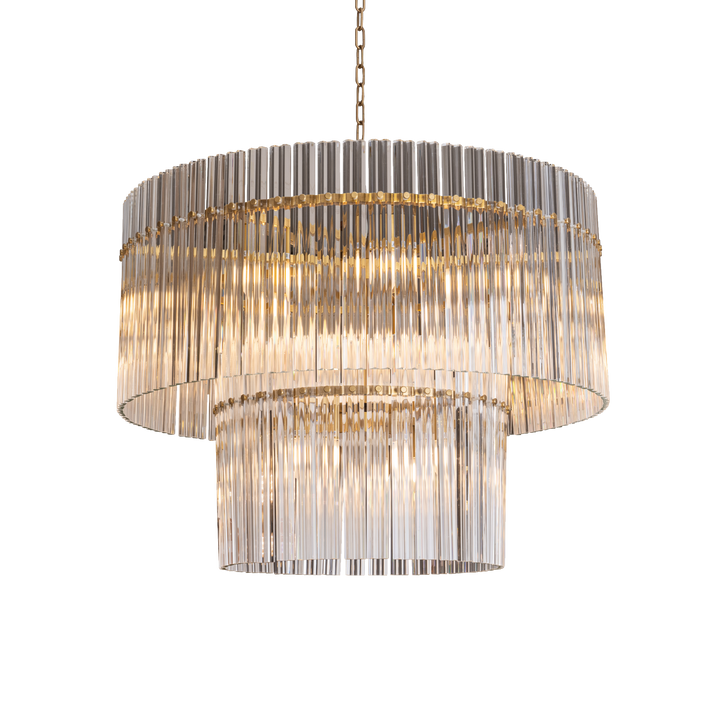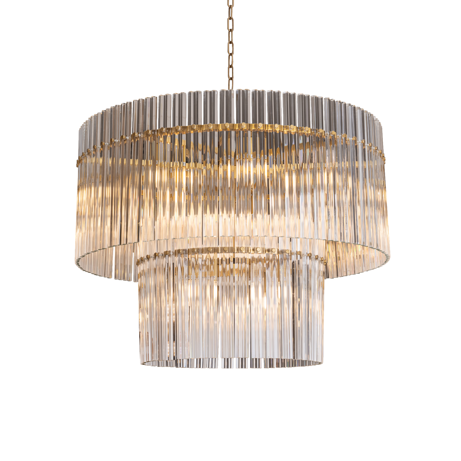 Combining clear fluted glass with an antique brass finish, this striking two-tier chandelier brings both elegance and style to any interior. Vertical glass panels are fixed with spherical pins, adding a subtle decorative touch.
