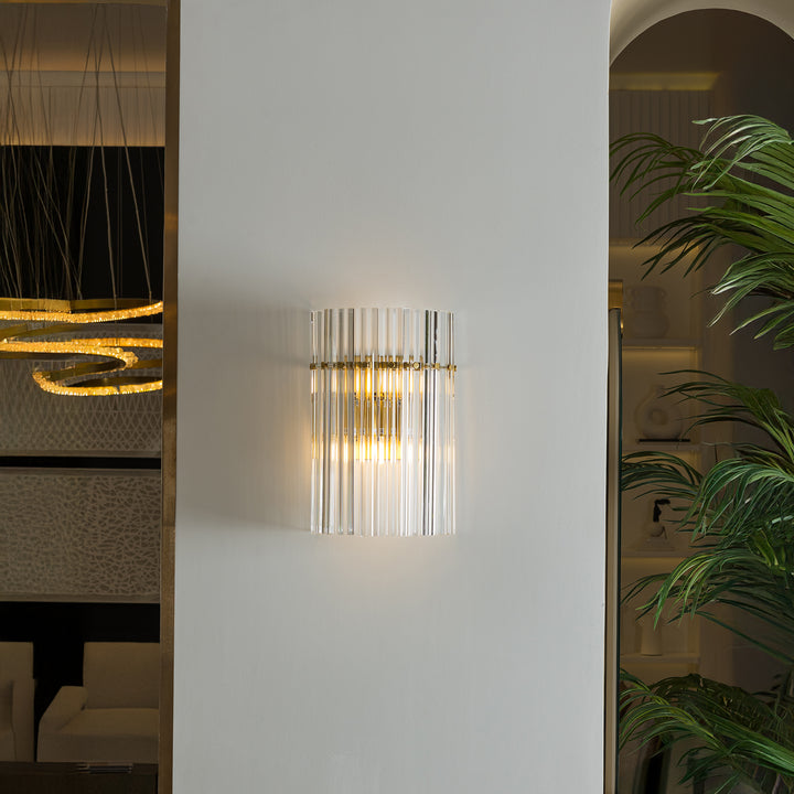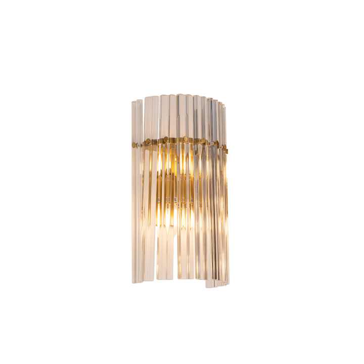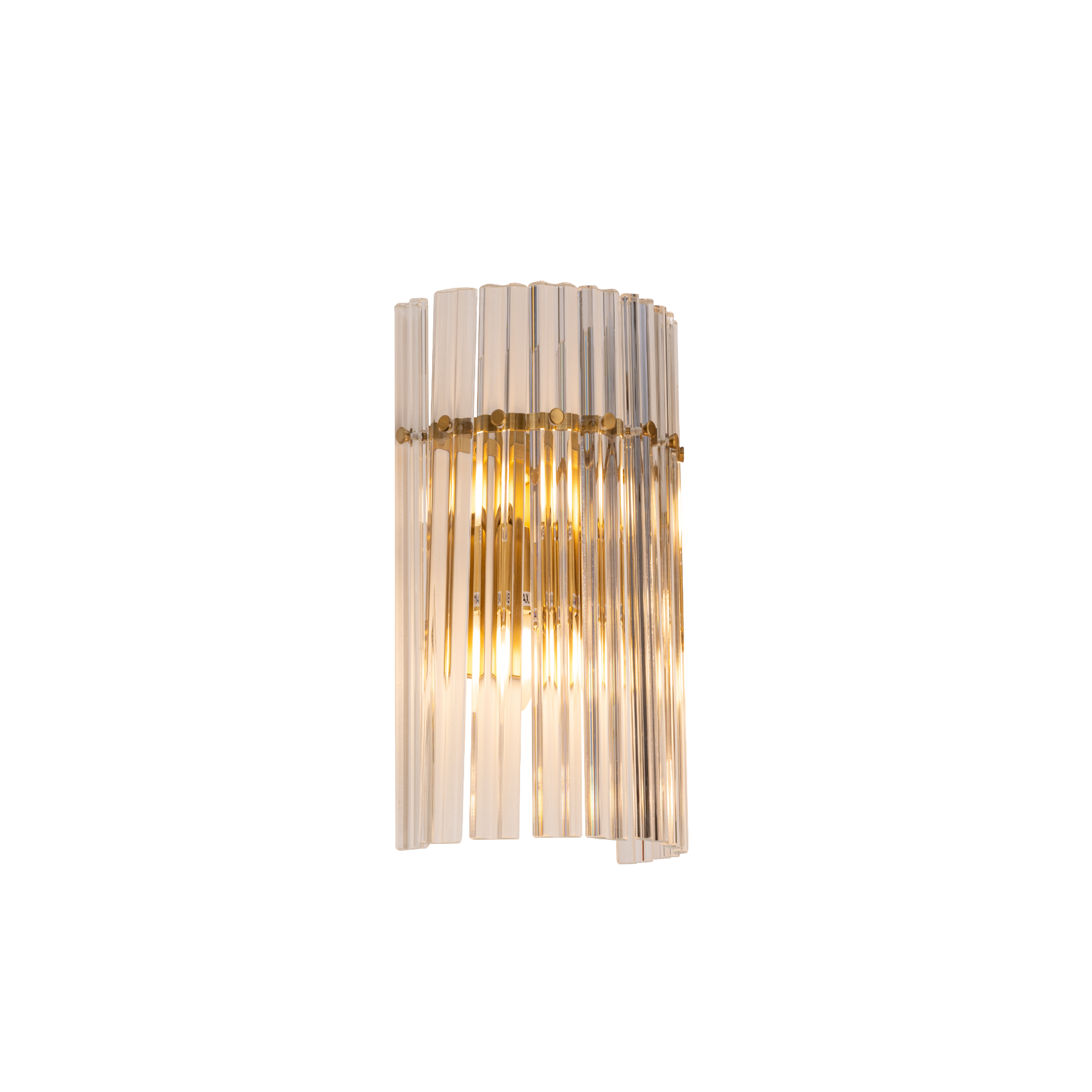 An elegant extension of our aster collection, this wall lamp mirrors the art deco inspiration. Featuring clear fluted glass framed in antique brass, it reflects the collection’s architectural elegance in a more intimate form.