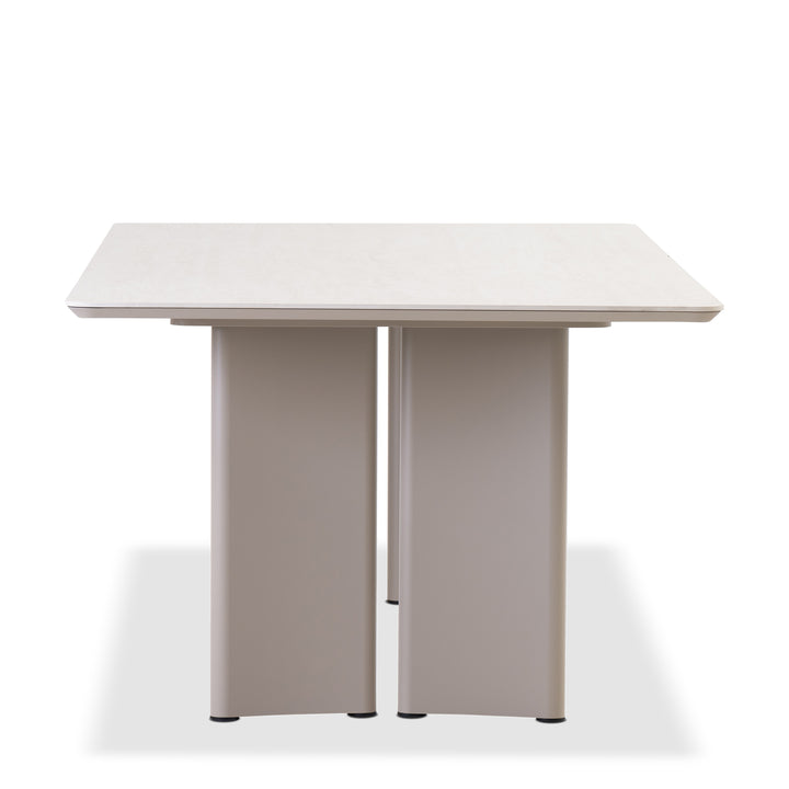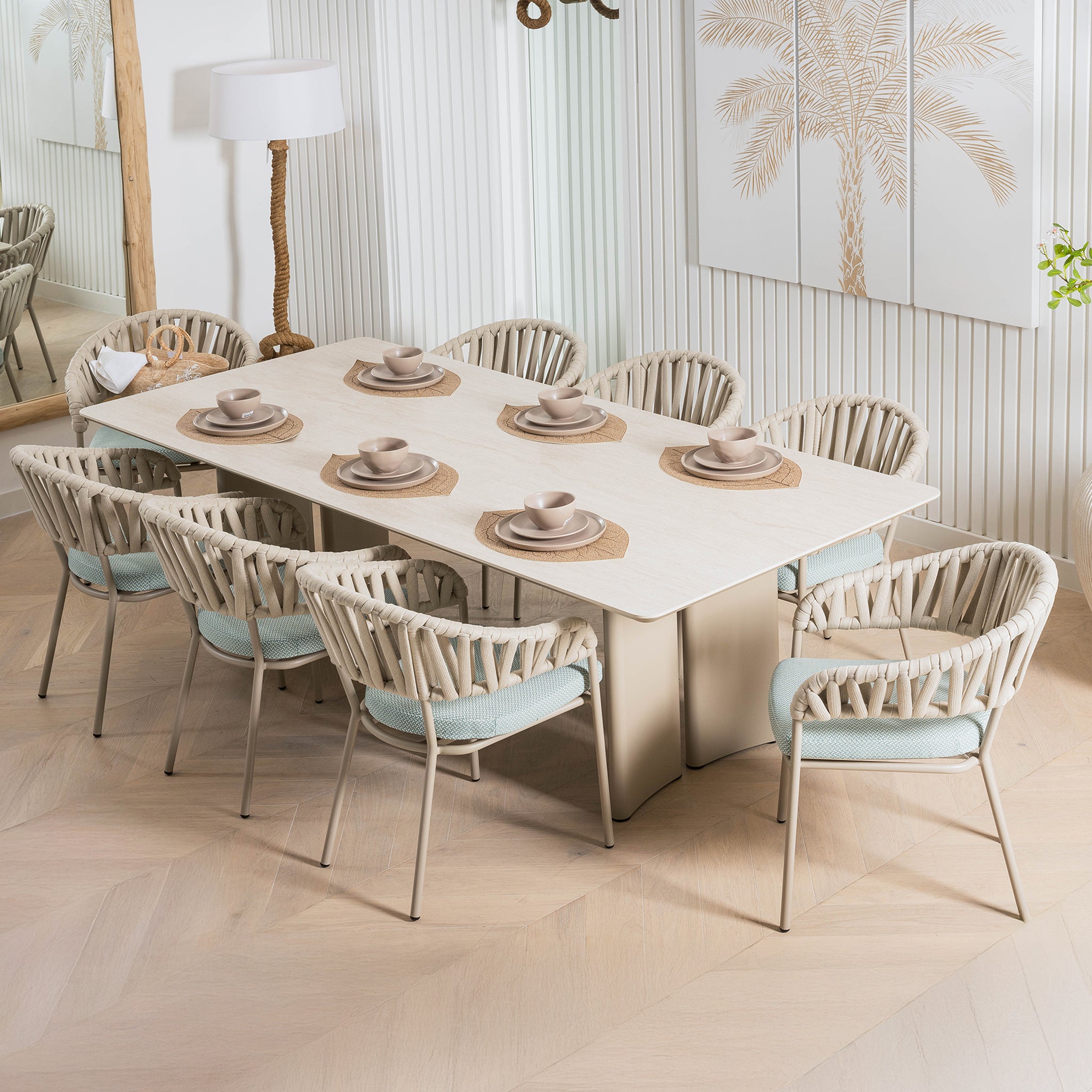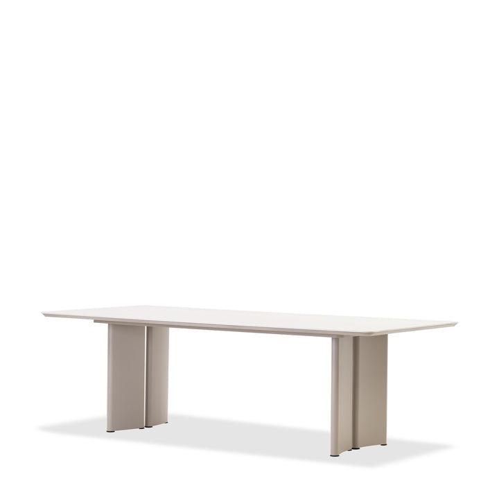 The ceramic top rests on gracefully curved aluminum legs, finished in a durable powder coat built to withstand the elements. Designed for open-air dining, its sculptural silhouette offers a quiet sophistication that anchors patios, terraces, and garden settings.