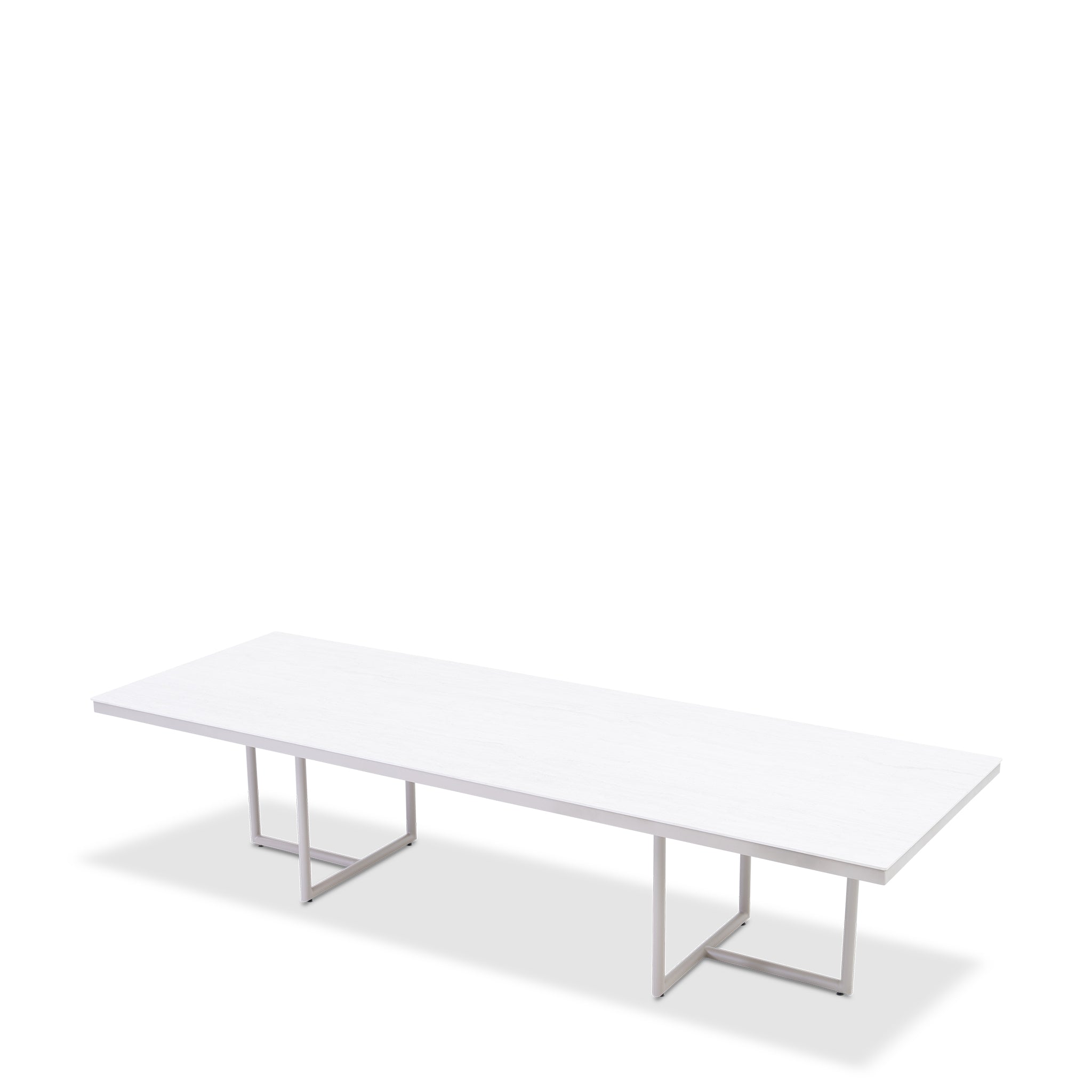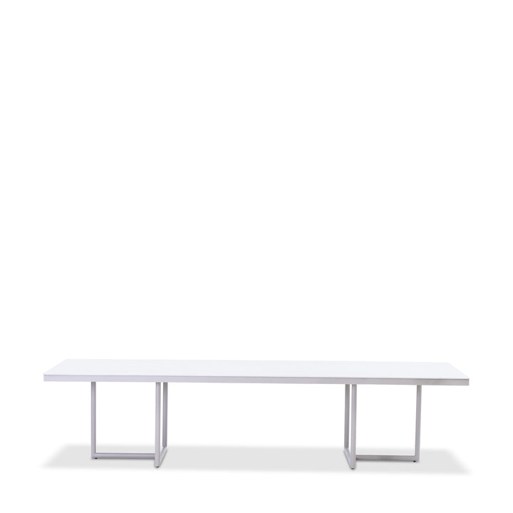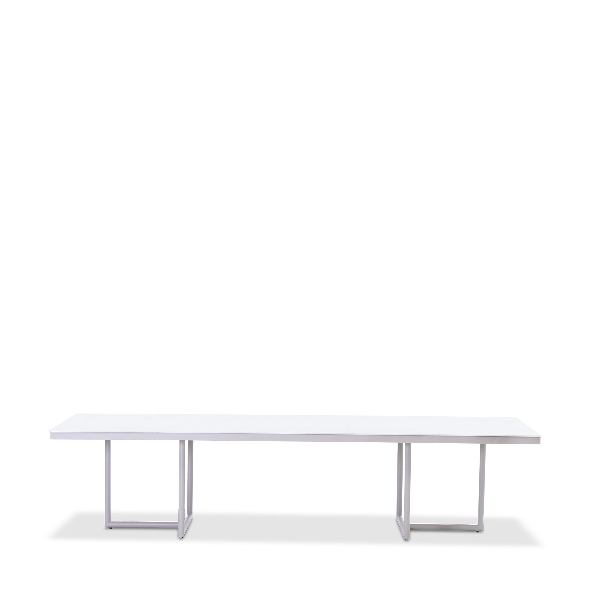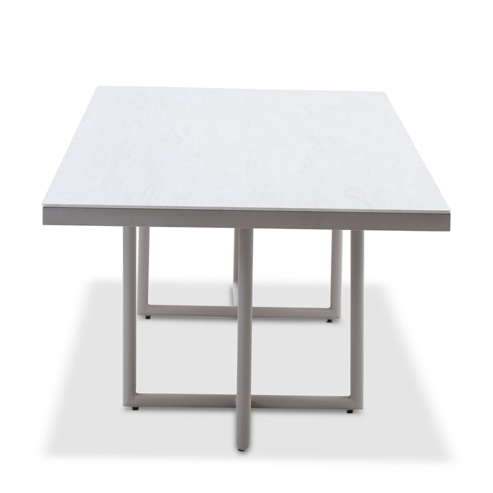 Designed for modern outdoor living, this 3-meter rectangular dining table features a ceramic top set over a simple, modern base crafted from powder-coated aluminum. The crisp silhouette and angular frame lend a strong sculptural presence, offering both durability and visual harmony. Generous in scale, it comfortably accommodates larger gatherings, making it an ideal centerpiece for expansive patios, terraces, and alfresco dining settings. Pair with the victory dining chair to complete the look.