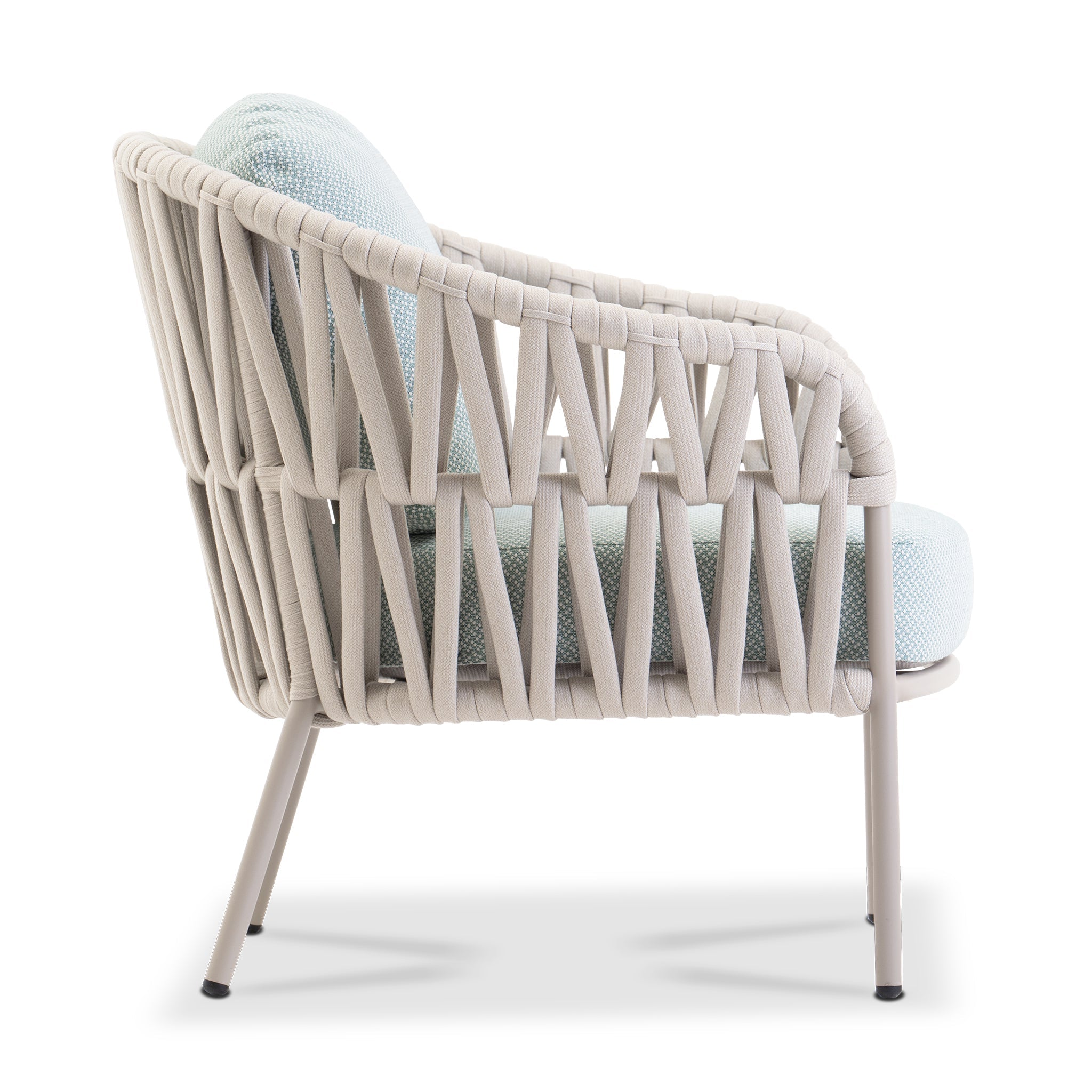 Designed to complement the victory 3-seater sofa, this lounge chair merges striking form with modern detailing. A powder-coated aluminum frame is wrapped in a handwoven, triangular full-weave rope pattern, while cushions upholstered in lattice teal fabric complete the look.