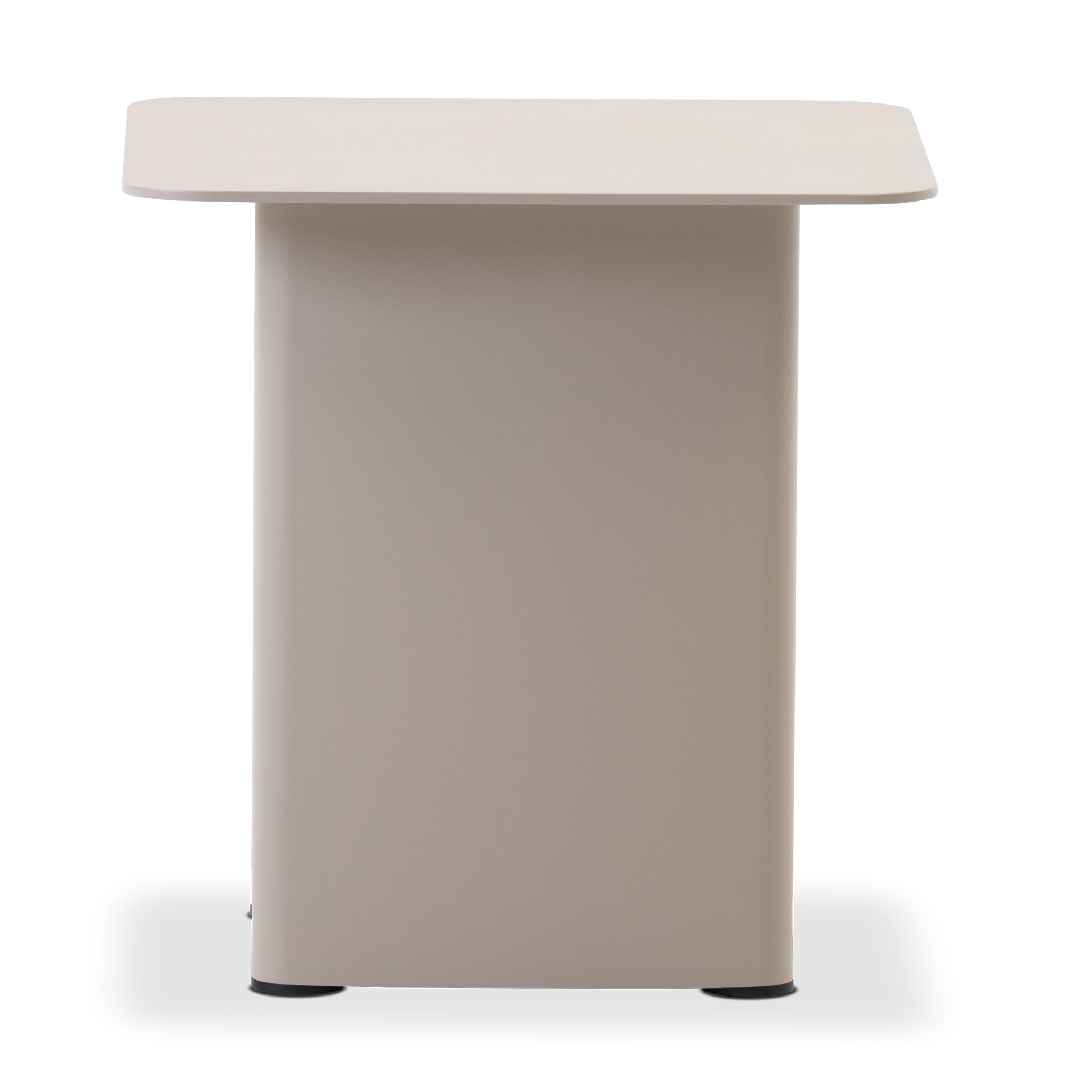 This outdoor side table features a sleek square top and curved base, crafted from durable powder-coated aluminum. Its compact design fits easily into any space. A perfect match with the crown collection for a complete outdoor setup.