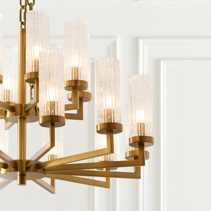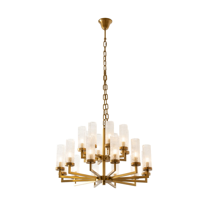 A signature piece from the volker collection, this chandelier reflects art deco elegance through its broken-glass design and antique brass-finished frame. The layered composition enhances its sculptural appeal, adding depth and style.