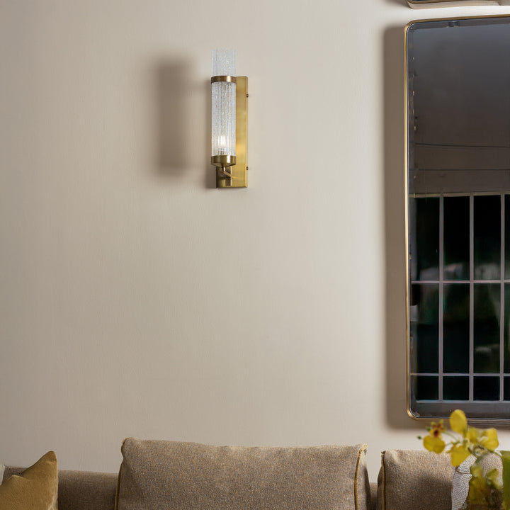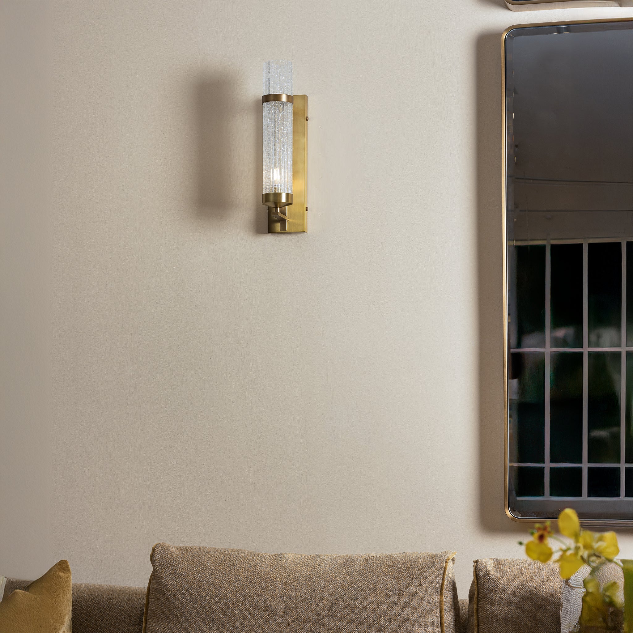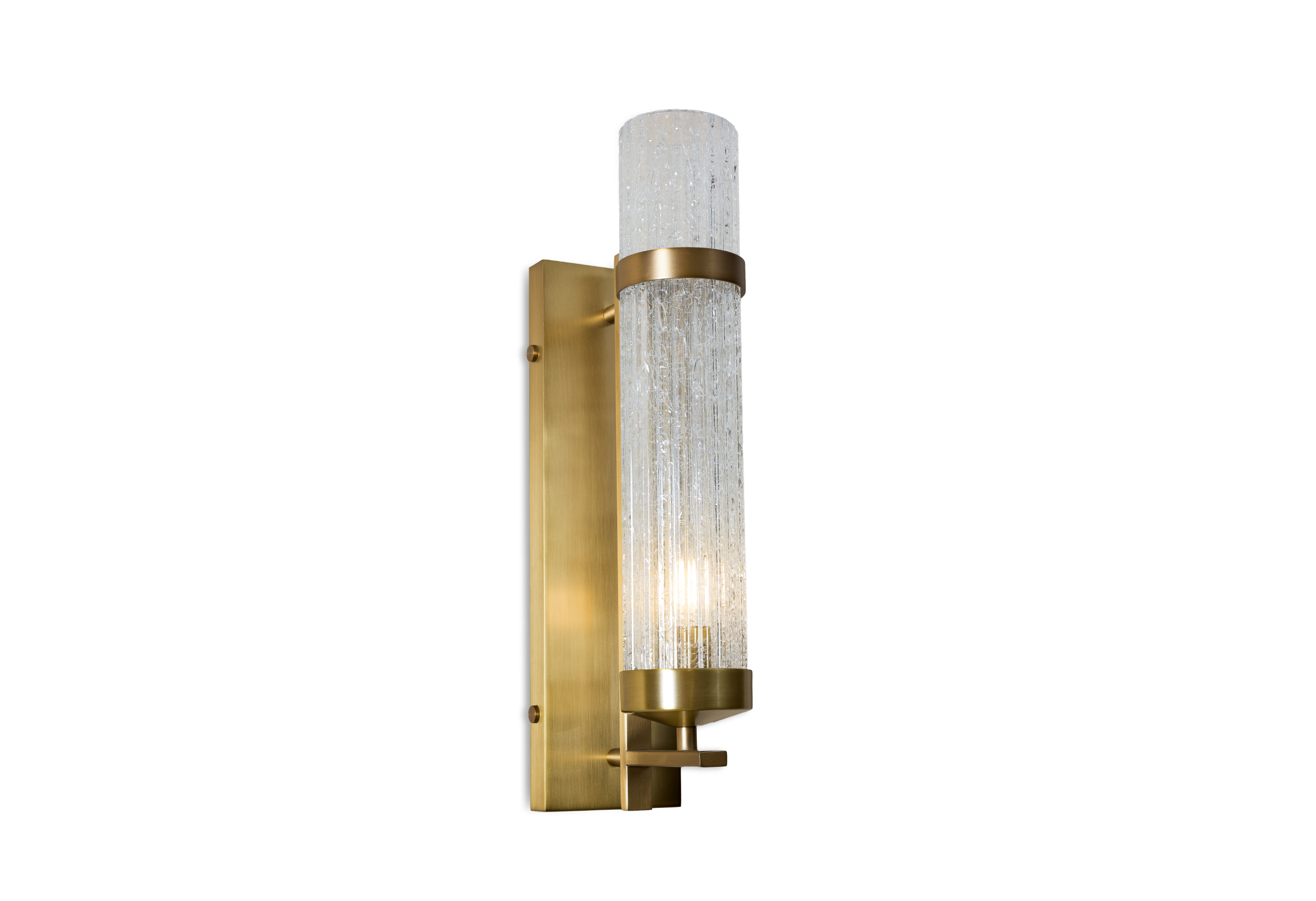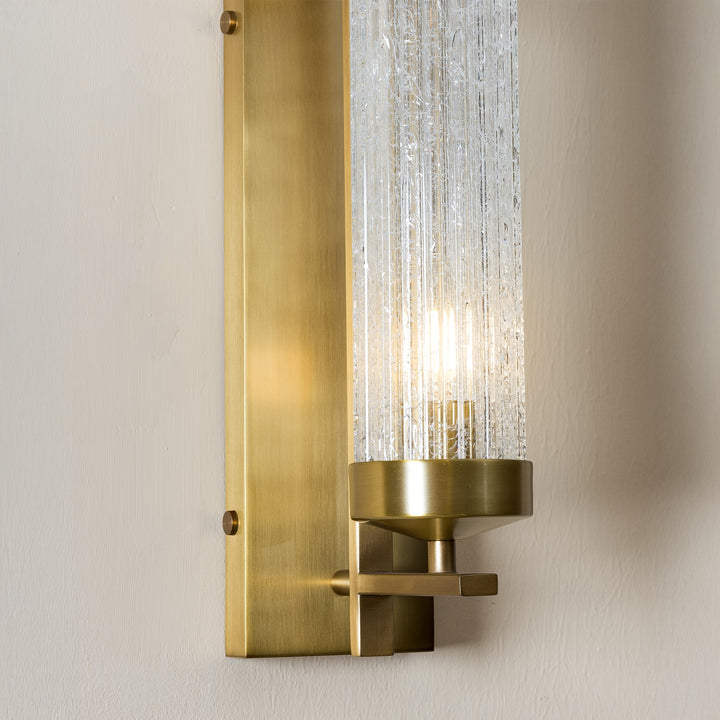 Designed to complement the volker chandelier, this wall lamp embodies art deco elegance. The broken-glass shade and antique brass frame enhance its refined appeal, while its vertical form creates a timeless statement on the wall.