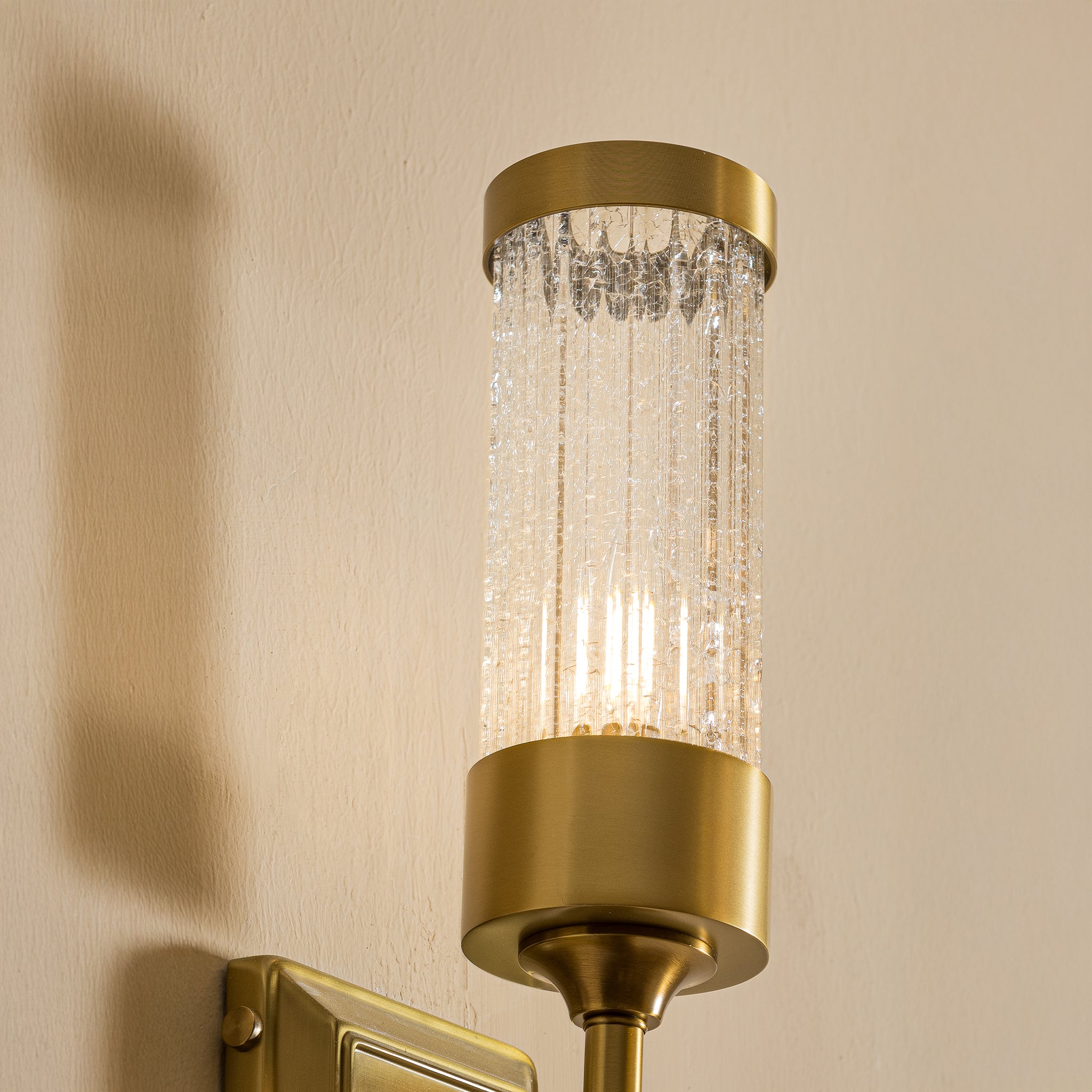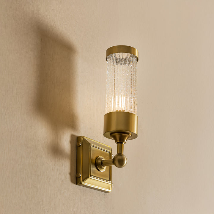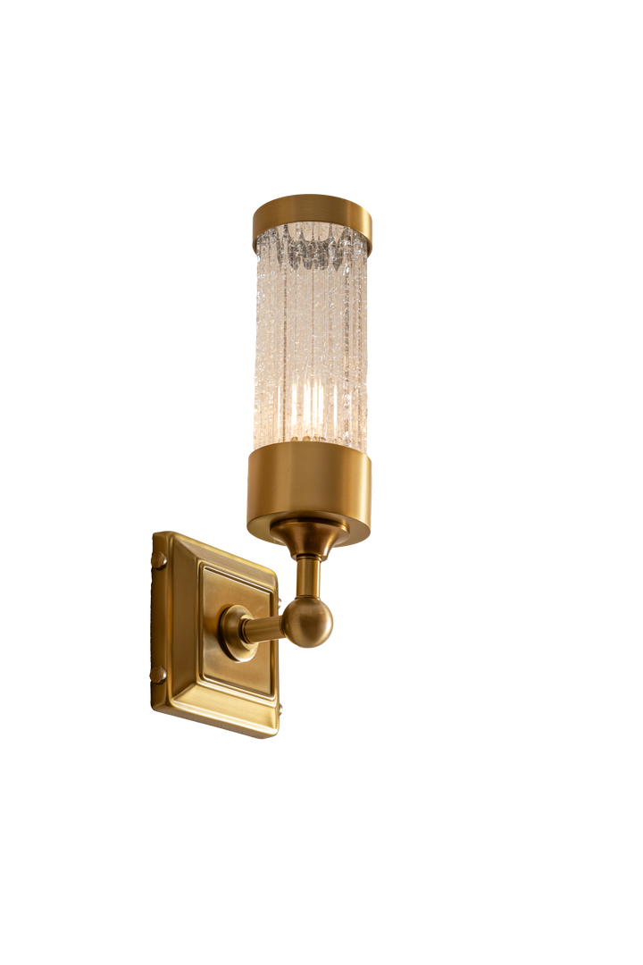 A refined extension of the volker collection this wall lamp mirrors its refined geometry and art deco inspiration. Clear broken glass set in an antique brass frame adds a touch of style and sophistication.