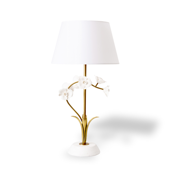Adding a touch of graceful elegance, this table lamp showcases a floral-inspired design with finely crafted ceramic blooms on a gently curved brass-finished stem.