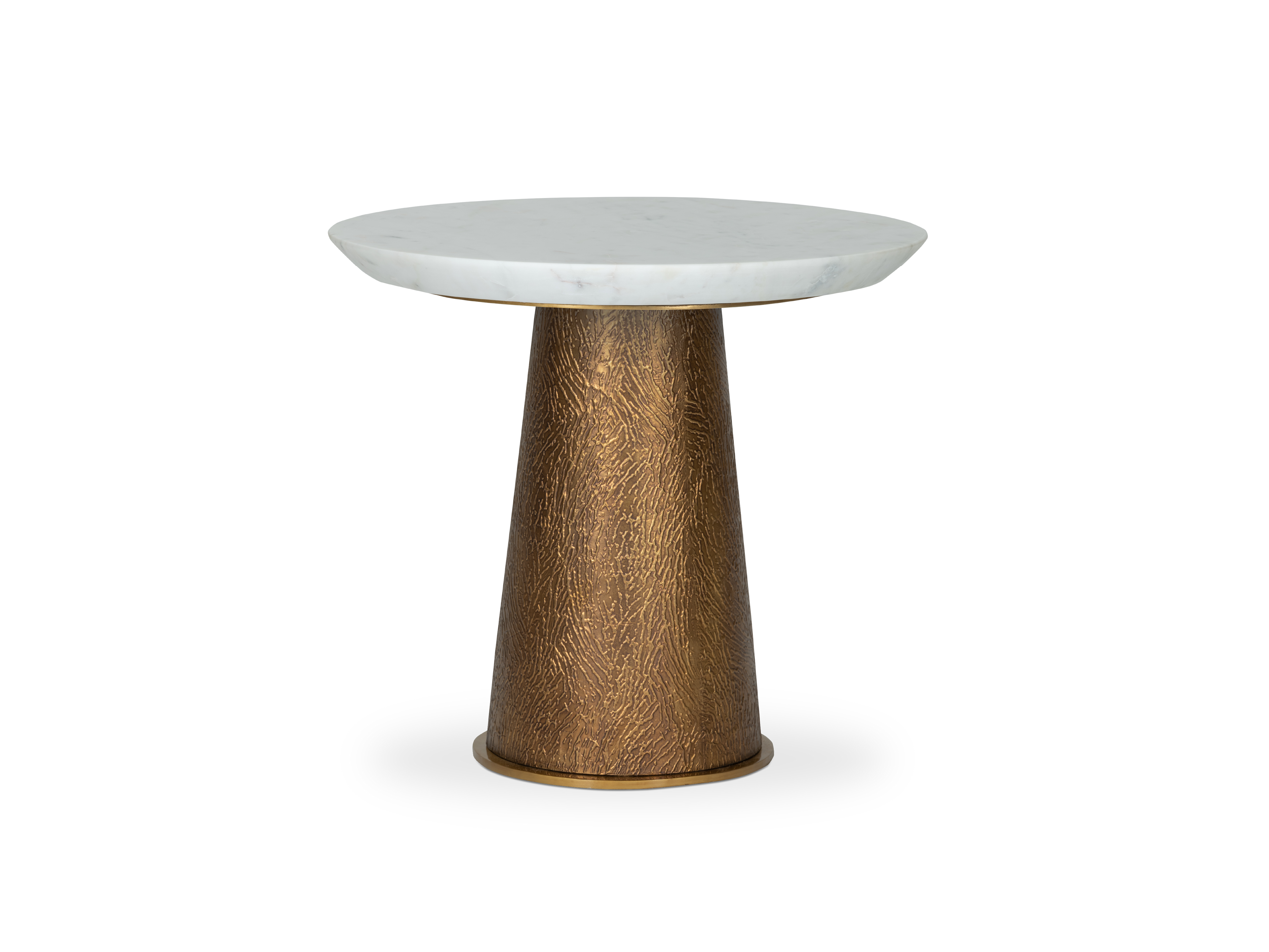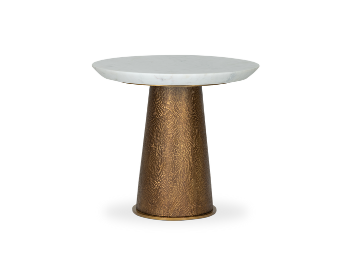 Features a top crafted from white banswara marble, finished with a polished surface that highlights the stone’s natural veining and character. The base is cladded in natural textured brass metal sheet with a burnished brass finish, showcasing skilled artisan craftsmanship.