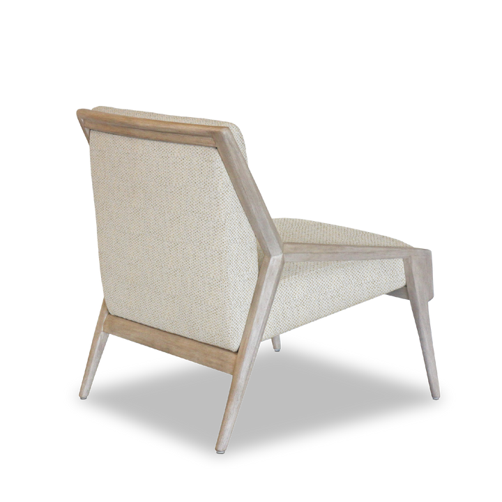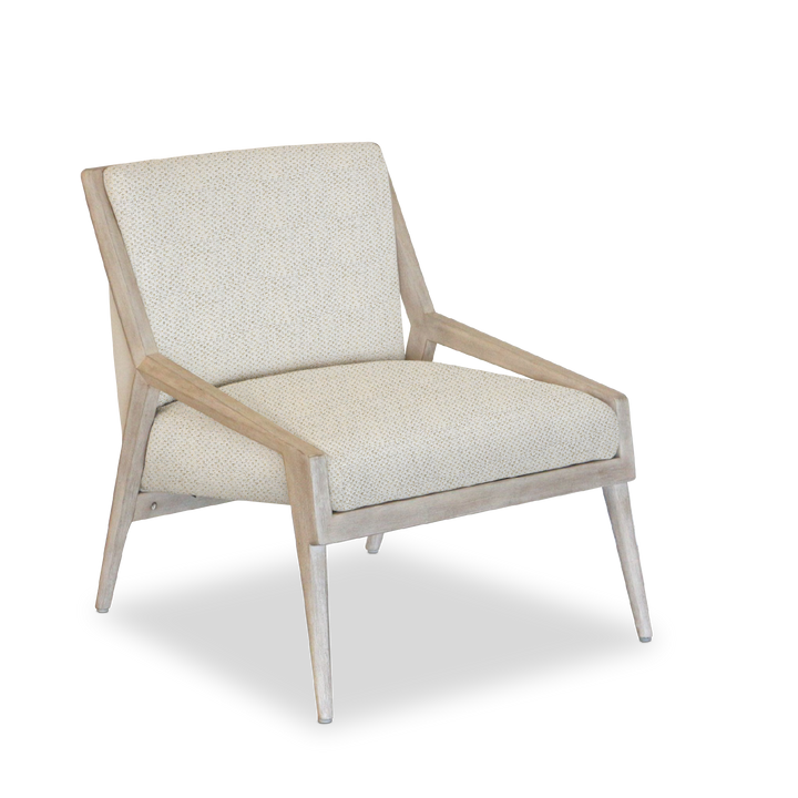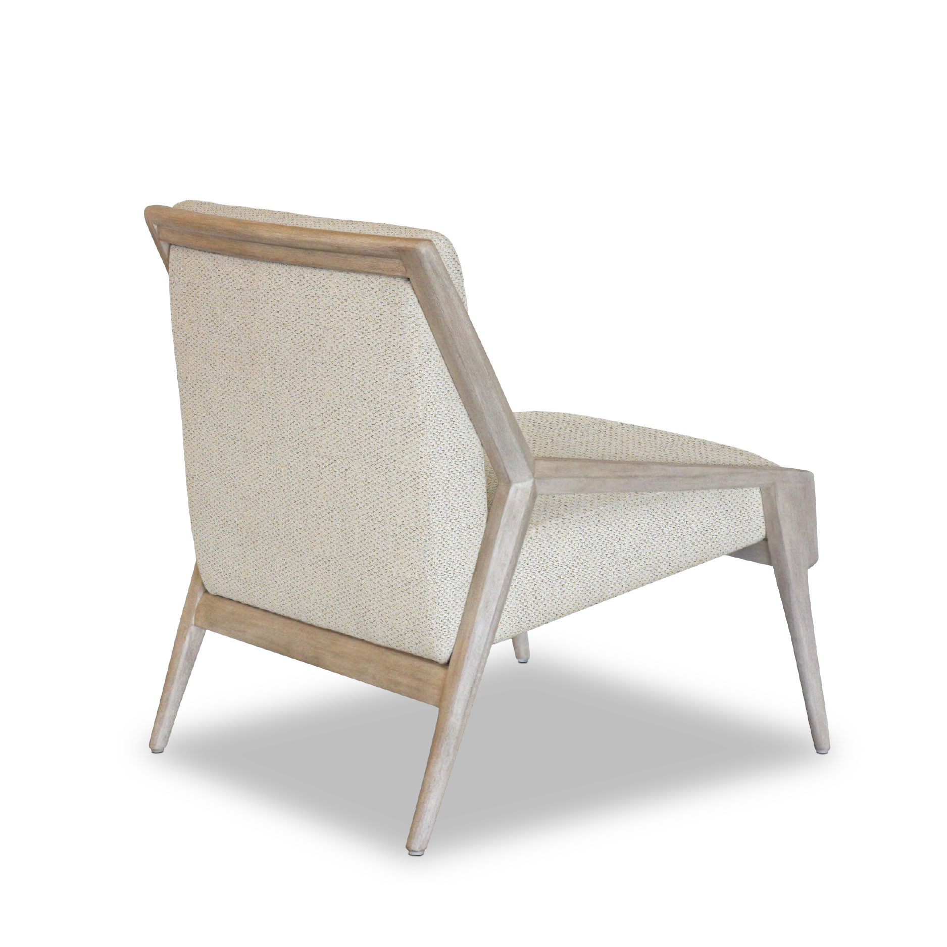 Built for comfort with an open frame design, this armchair adds a sculptural touch to any indoor space. Its solid mahogany frame in matte ceruse white offers refined character, while the upholstery provides comfort and style.