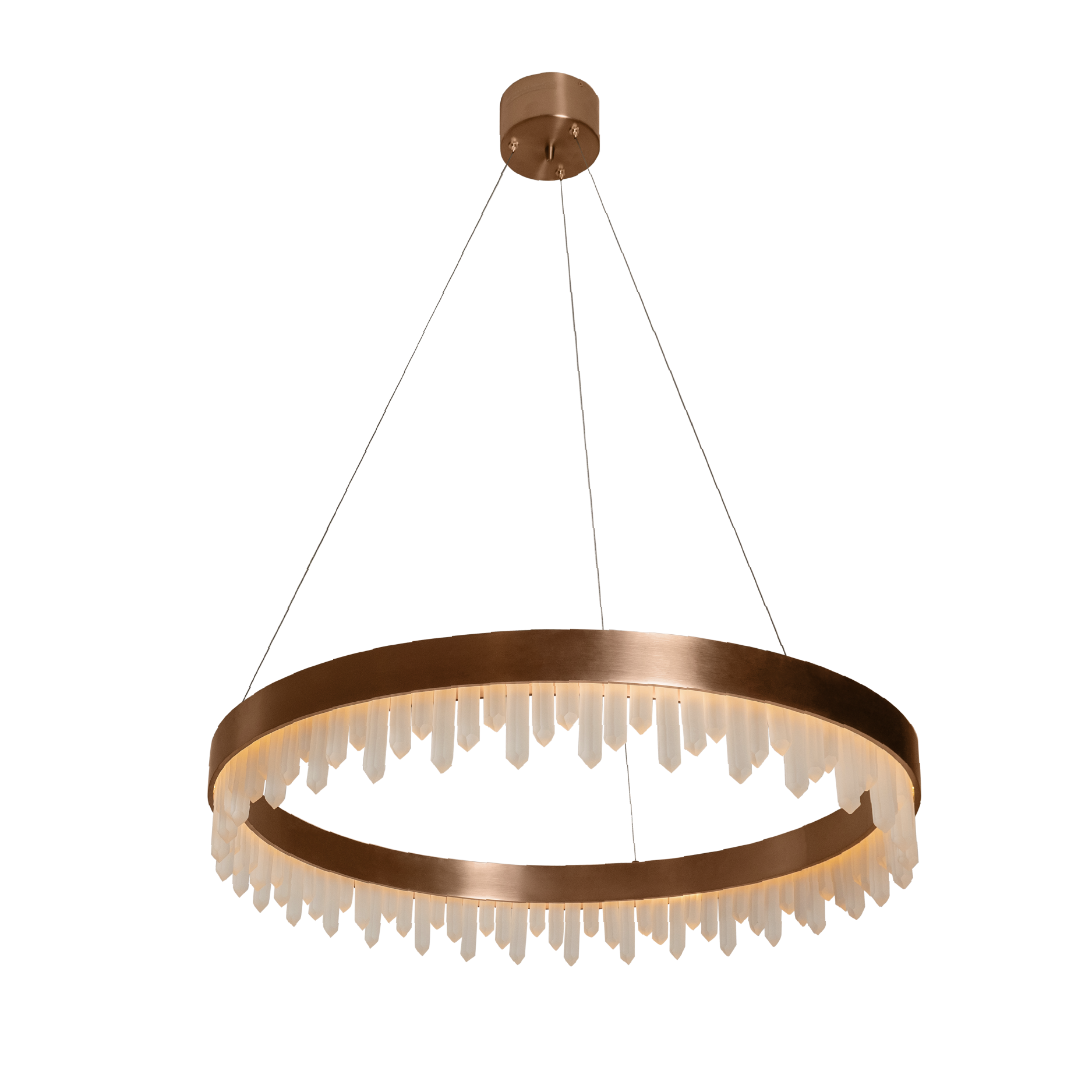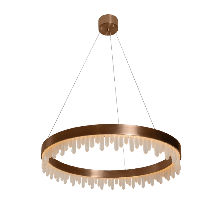 Combining a quartz-inspired design with glass and a brass finish, this single-tier round chandelier adds visual appeal to your home. The glass elements echo the look of natural quartz and are arranged within a circular frame to create a clean and balanced silhouette.